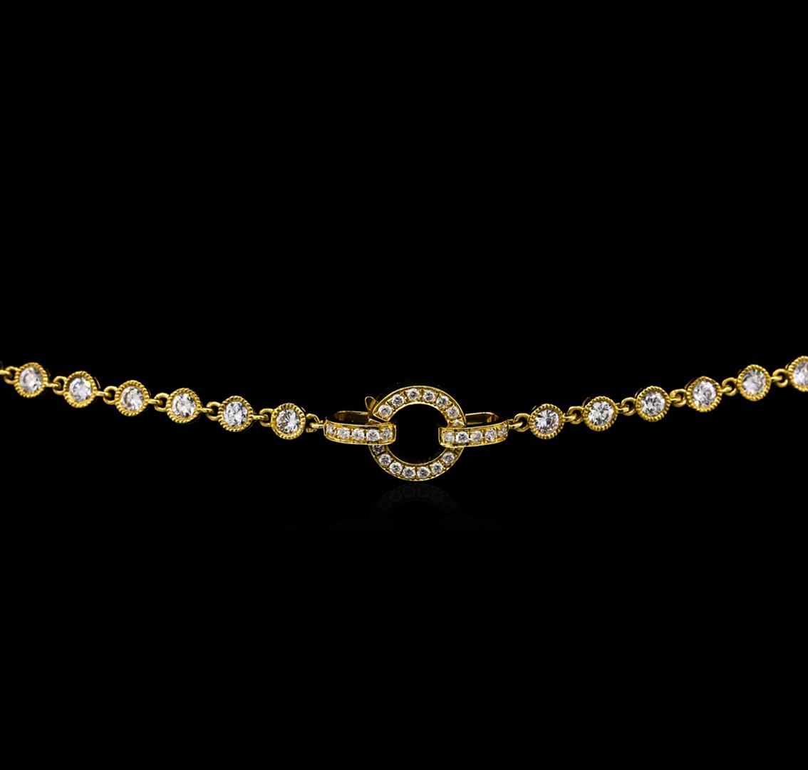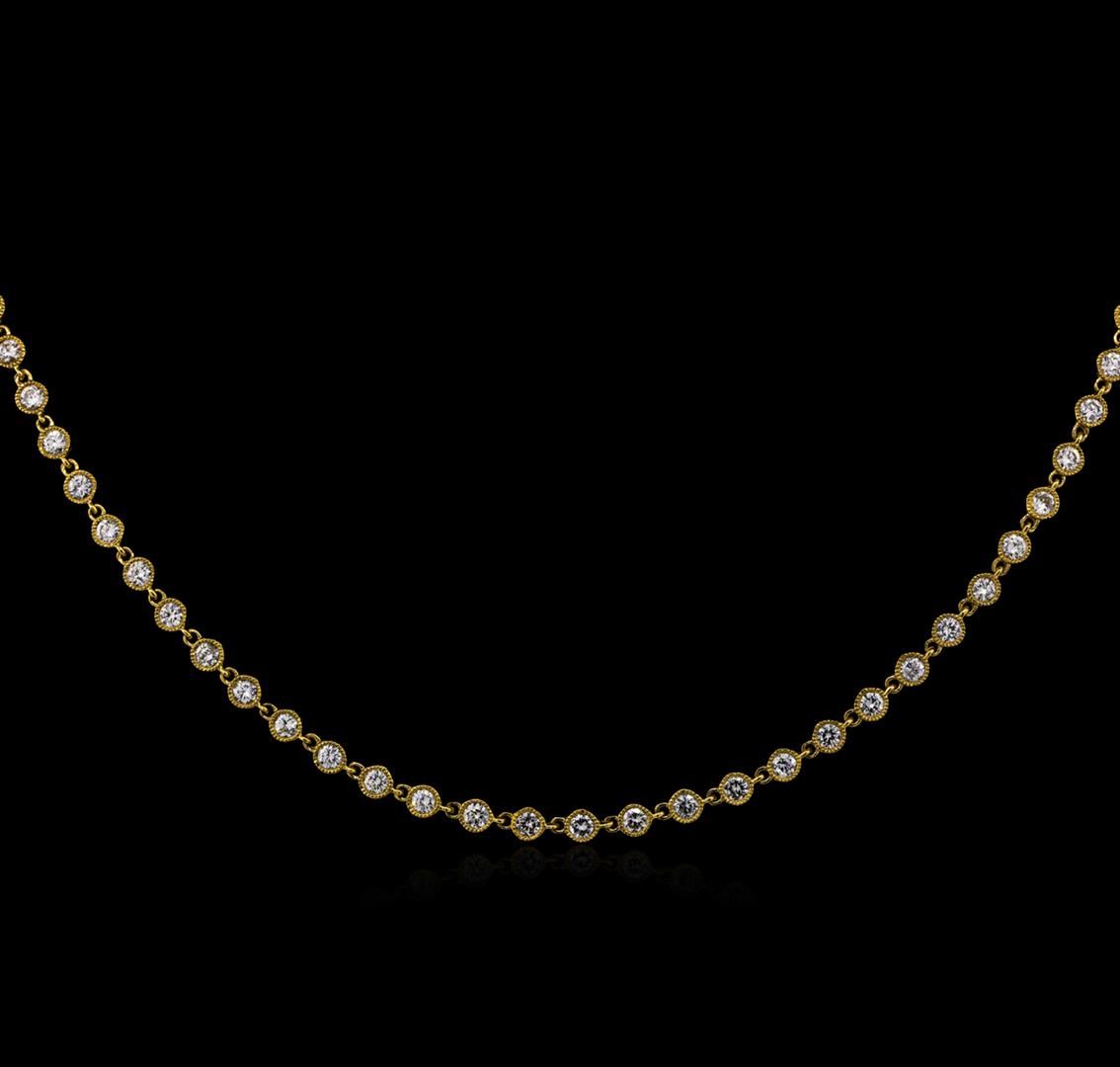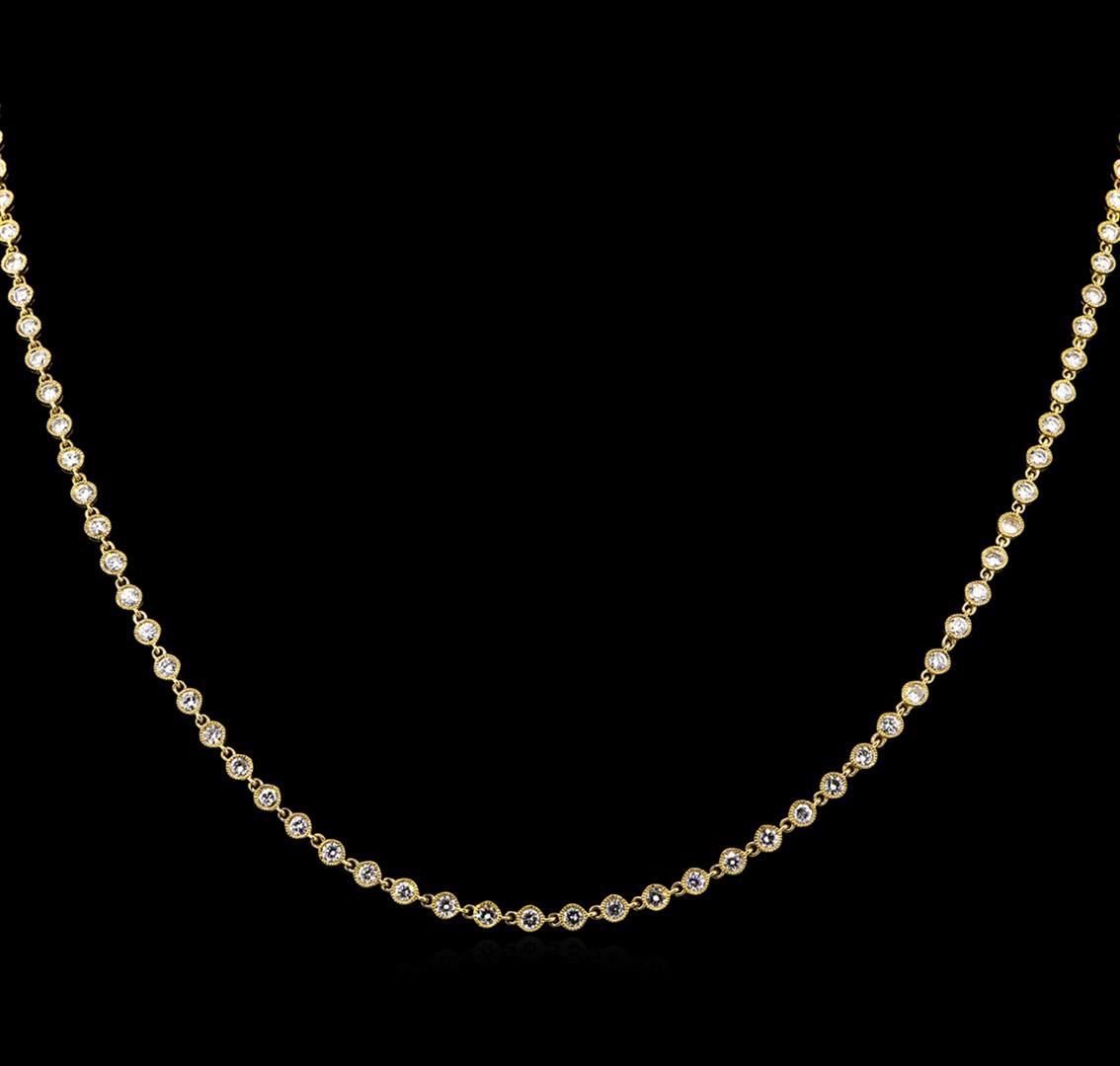 One electronically tested 18KT yellow gold ladies cast & assembled diamond necklace. Twenty five inch length necklace features a diamond link ribbon supported by a removable diamond set hinge snap locking ring that connects the end links. Bright polish finish with milgrain detailing. Trademark is MICHA. Identified with markings of "18K 750". Condition is new, good workmanship. Containing: One Hundred Eight bezel set round brilliant cut diamonds approximate total weight of 108 Stones = 7.78ct. The clarity grade reflects the entire range of clarity for this group. Graded in the setting. Clarity: VS-2 to I-1. Color: E - G Twenty-Five bezel set round brilliant cut diamonds approximate total weight of 25 Stones = 0.23ct. Graded in the setting. Clarity: SI-1 to I-1. Color: E - G. Total Weight of Diamonds 8.01ct. Total Weight of Necklace 21.77gm. AIG Appraised at $30,240.00.