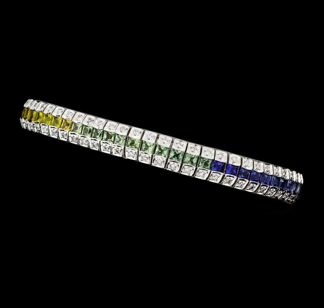 One electronically tested 14KT white gold lady's combination cast & assembled fashion bracelet with a tongue clasp with foldover safety with a bright polish finish. The featured lady's bracelet measures approximately 7 inches in length. Identified with markings of '14K'. Condition is new, good workmanship. Containing: Sixty-two channel set princess cut natural multi-color sapphires, measuring 2.50 x 2.40 x 1.56mm, (depth est.) approximate total weight of 8.01ct., clarity is slightly included, cut is very good. The featured sapphires range in color from pink to violetish pink to blue to green to yellow to orange. Transmitting light with no distortion, transparent. Colored gemstones are presumed to have been subjected to commonly used enhancement processes. Graded in the setting. One Hundred Twenty-Four prong set round brilliant cut diamonds, measuring 1.45 - 1.35 x 0.84mm (depth est.) approximate total weight of 124 Stones = 1.25ct. Graded in the setting. Color H - I Clarity SI-1 to I-1 Cut Good. Total Weight of Colored Stones 8.01ct.. Total Weight of Diamonds 1.25ct.. Total Weight of Bracelet 27.30gm GAS Appraised at $13585.00. GAS Appraised at $13,585.00.