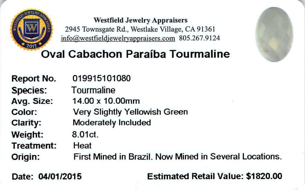 One oval cabochon cut natural Paraiba tourmaline exact weight 8.01ct., clarity is moderately included, cut is good. Westfield Appraised at $1,820.00.