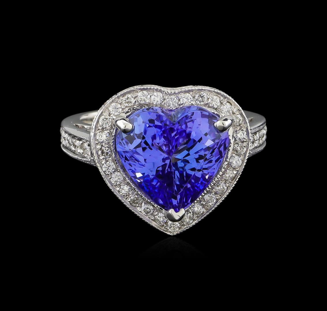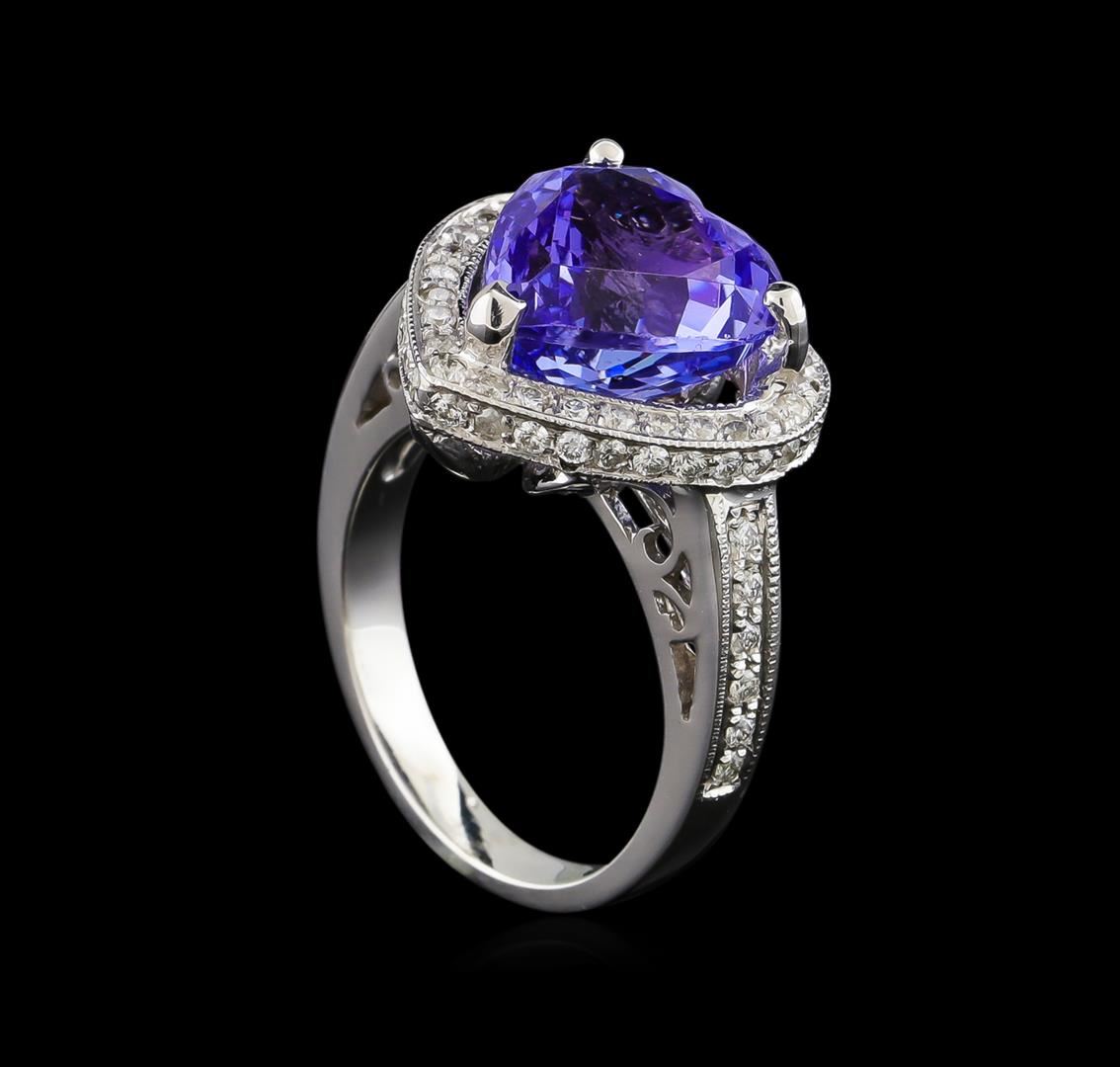 One electronically tested 14KT white gold lady's cast heart shape ring with a basket halo with a bright polish with milgrain detailing finish. The featured lady's ring has a shank measuring 2.85 millimeters wide. Identified with markings of "K14". Condition is new, good workmanship. Containing: One prong set heart modified brilliant cut natural tanzanite, measuring 11.85 x 11.48 x 8.27mm, 9%. bulge factor, approximate weight of 8.02ct., clarity is eye clean, type I, medium dark, moderately strong, bluish violet color, (GIA bV 6/4), cut is very good. Transmitting light with no distortion, transparent. Colored gemstones are presumed to have been subjected to commonly used enhancement processes. Graded in the setting. Seventy-Eight prong set round brilliant cut diamonds, measuring 1.40 - 1.30 x 0.84mm (depth est.) approximate total weight of 78 Stones = 0.76ct. Graded in the setting. Clarity: SI-1 to I-1. Color: H - I. Cut Good. Total Weight of Colored Stones 8.02ct. Total Weight of Diamonds 0.76ct. Total Weight of Ring 9.10gm. GAS Appraised at $16,900.00.