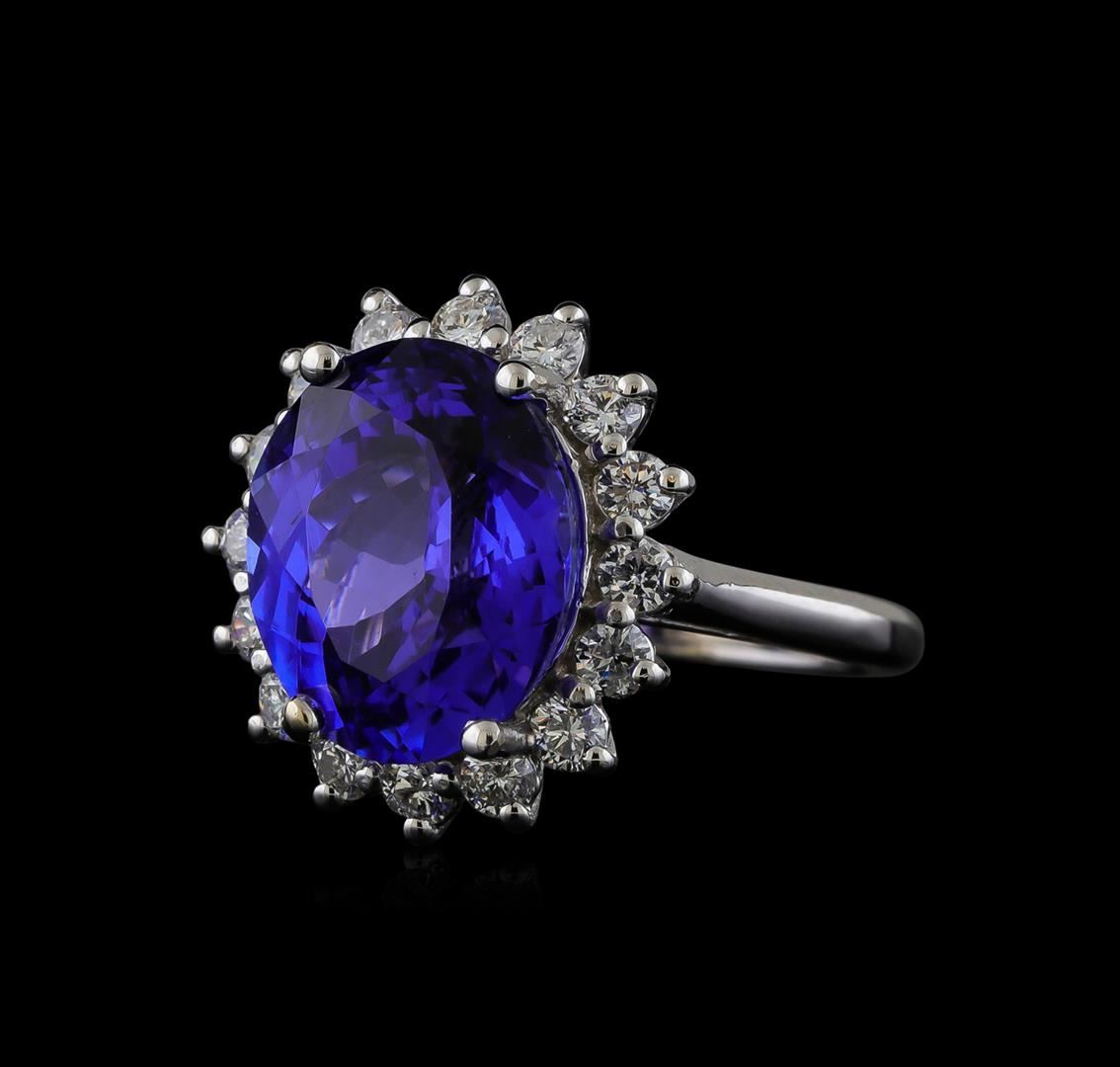 One electronically tested 14KT white gold lady's cast fashion ring with a basket halo with a bright polish finish. The featured lady's ring has a shank measuring 1.95 millimeters wide. Identified with markings of '14K'. Condition is new, good workmanship. Containing: One prong set oval modified brilliant cut natural tanzanite, measuring 13.49 x 11.41 x 7.65mm, (depth est.) approximate weight of 8.04ct., clarity is eye clean, medium dark, moderately strong, violet color, (GIA V 6/4), cut is very good. Transmitting light with no distortion, transparent. Colored gemstones are presumed to have been subjected to commonly used enhancement processes. Graded loose prior to setting in the GIA Laboratory, Report #2175665830. Sixteen prong set round brilliant cut diamonds, measuring 2.50 - 2.40 x 1.47mm (depth est.) approximate total weight of 16 Stones = 0.86ct. Graded in the setting. Clarity SI-1 to I-1. Color: H - I Cut Good. Total Weight of Colored Stones 8.04ct.. Total Weight of Diamonds 0.86ct.. Total Weight of Ring 6.90gm GAS Appraised at $15,465.00.