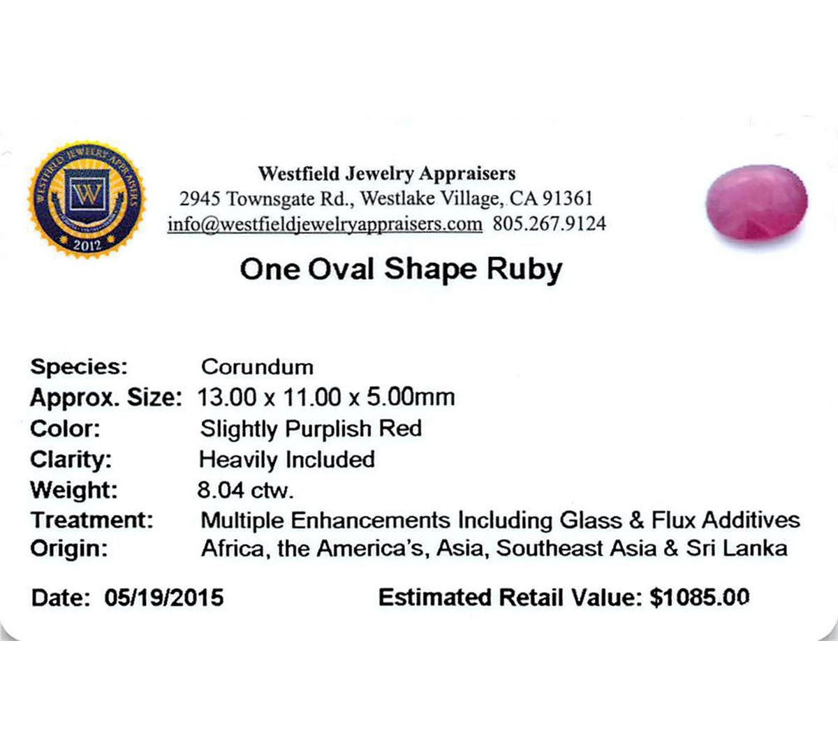 One oval mixed cut natural ruby, measuring 13.00 x 11.00 x 5.00mm, exact weight 8.04ct., clarity is heavily included, type II, medium dark, very slightly brownish, slightly purplish red color, (GIA slpR 6/3), cut is good. Westfield Appraised at $1,085.00.