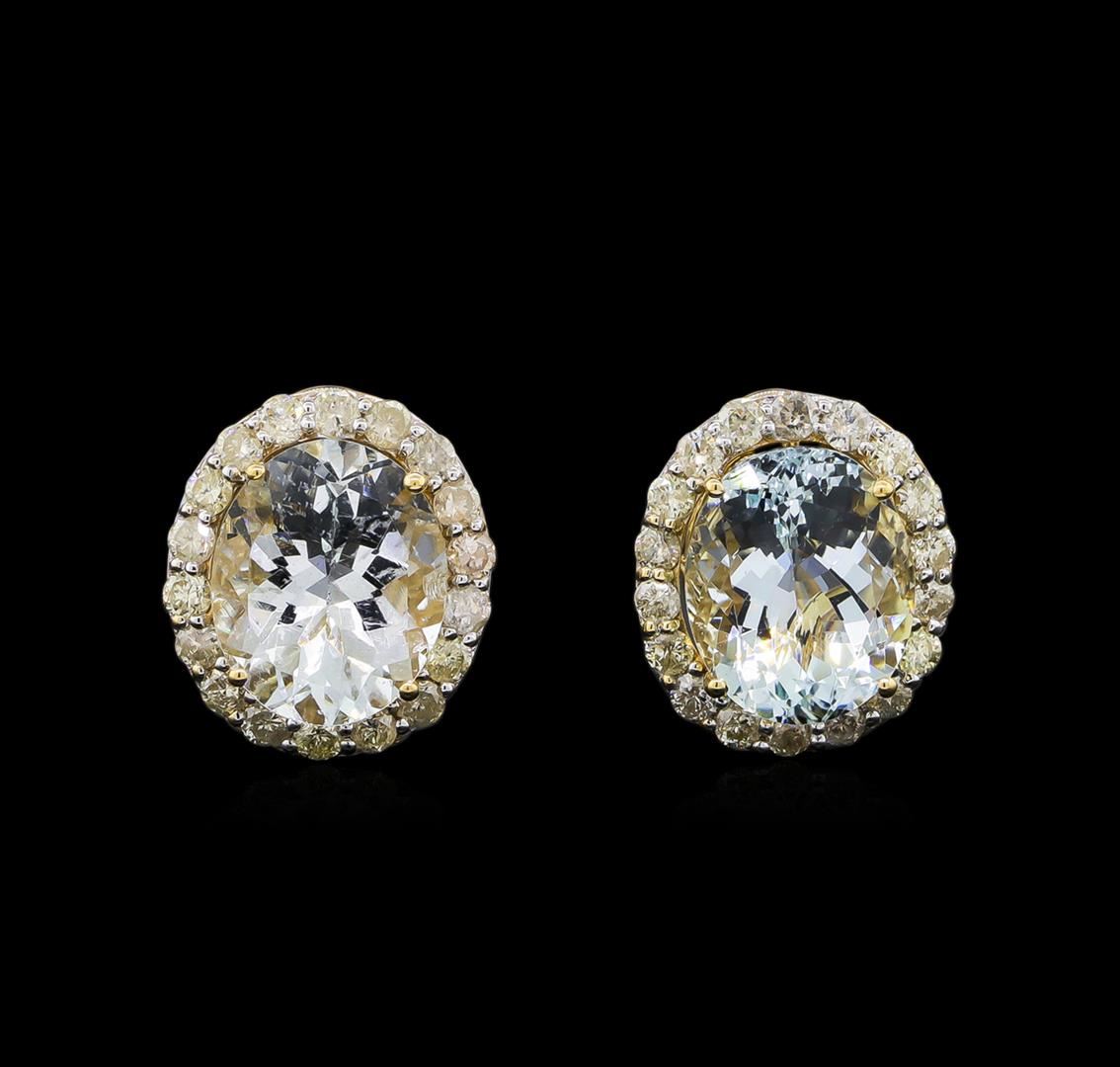 One pair electronically tested 14KT yellow gold lady's combination cast & assembled fashion earrings with Omega clip backs with posts with a bright polish finish. Trademark is Orianne. Identified with markings of "14K". Condition is new, good workmanship. Containing: Two prong set oval modified brilliant cut natural aquamarines, measuring 11.94 x 9.77 x 6.41mm, approximate total weight of 8.05ct., clarity is slightly included, type I, light, moderately strong, very slightly greenish blue color, (GIA vslgB 3/4), cut is very good. Transmitting light with a minimum of distortion, transparent. Colored gemstones are presumed to have been subjected to commonly used enhancement processes. Graded in the setting. Thirty-Six prong set round brilliant cut diamonds, measuring 2.20 - 2.10 x 1.33mm (depth est.) approximate total weight of 36 Stones = 1.35ct. Graded in the setting. Clarity: SI-2 to I-2. Color: J - Good. Total Weight of Colored Stones 8.05ct. Total Weight of Diamonds 1.35ct. Total Weight of Earrings 5.60gm. GAS Appraised at $9,760.00.