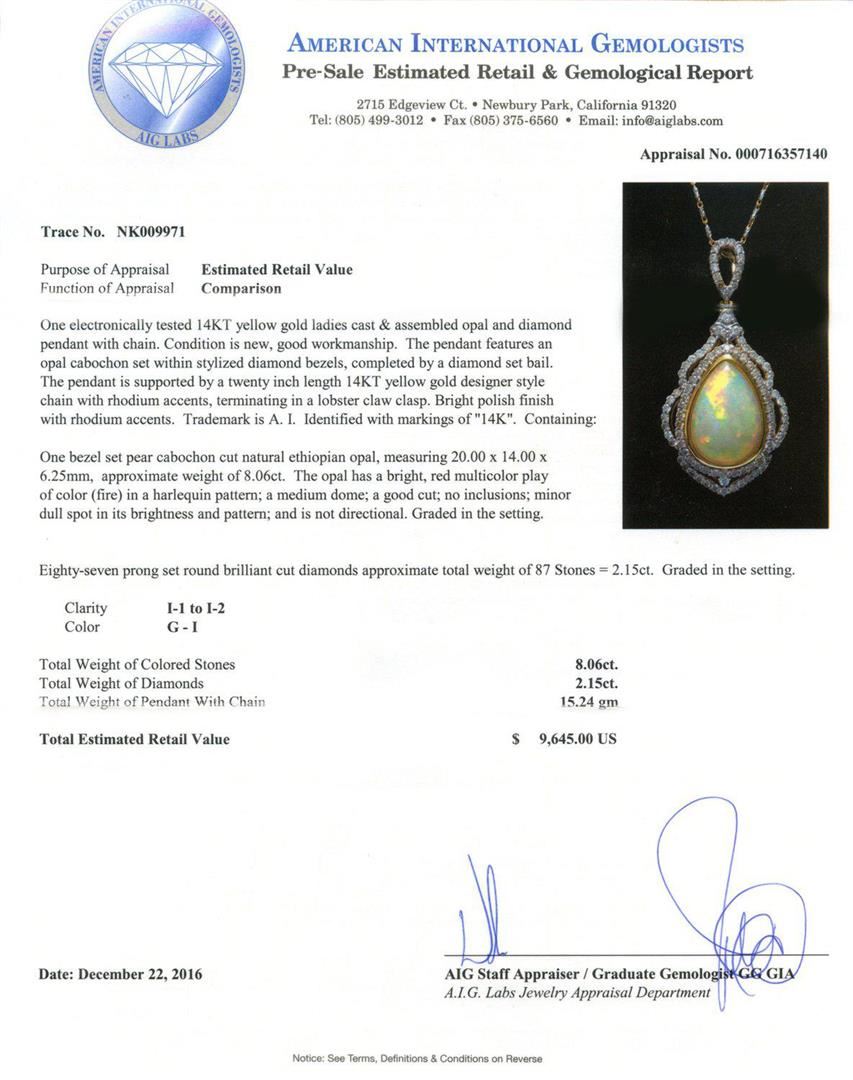 8.06ct Ethiopian Opal and 2.15ctw Diamond 14K Yellow Gold Necklace. One electronically tested 14KT yellow gold ladies cast & assembled opal and diamond pendant with chain. Condition is new, good workmanship. The pendant features an opal cabochon set within stylized diamond bezels, completed by a diamond set bail. The pendant is supported by a twenty inch length 14KT yellow gold designer style chain with rhodium accents, terminating in a lobster claw clasp. Bright polish finish with rhodium accents. Trademark is A. I. Identified with markings of "14K". Containing: One bezel set pear cabochon cut natural ethiopian opal, measuring 20.00 x 14.00 x 6.25mm, approximate weight of 8.06ct. The opal has a bright, red multicolor play of color (fire) in a harlequin pattern a medium dome a good cut no inclusions minor dull spot in its brightness and pattern and is not directional. Graded in the setting. Eighty-seven prong set round brilliant cut diamonds approximate total weight of 87 Stones = 2.15ct. Graded in the setting. Clarity I-1 to 1-2 Color G - I Total Weight of Colored Stones 8.06ct. Total Weight of Diamonds 2.15ct. Total Weight of Pendant With Chain 15.24 g