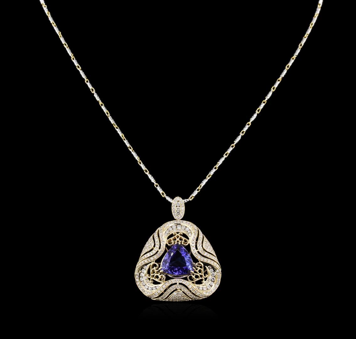 One electronically tested 14KT yellow gold ladies cast & assembled tanzanite and diamond pendant/enhancer with chain. The pendant/enhancer features a tanzanite set within an elaborate diamond lattice gallery, completed by a diamond set snap-locking bail. The pendant/enhancer is supported by an eighteen inch length 14KT yellow gold chain with rhodium accents, terminating in a lobster claw clasp. Bright polish finish with milgrain detailing. Trademark is Orianne. Identified with markings of "14K". Condition is new, good workmanship. Containing: One prong set triangle mixed cut natural tanzanite, measuring 13.20 x 12.80 x 6.60mm, 15%. bulge factor, approximate weight of 8.09ct., clarity is eye clean, type I, medium dark, very slightly grayish, bluish violet color, (GIA bV 6/3), cut is good. Transmitting light with no distortion, transparent. Colored Stone Grading Report attached. Graded in the setting. Tanzanite is a very rare gemstone that is only found in the country of Tanzania. Originally discovered in 1967. Tiffany & Company, named the stone Tanzanite. It is found in the Usumburu Mountains that border the Umba Valley of northern Tanzania. Tanzanite occurs in gray, brown, violet, blue, reddish-purple, & green. The gem is interesting because of its exceptional pleochroism. Rotated in different directions a tanzanite will exhibit multiple changes of color. Tanzanite has a low tolerance to ultrasonic cleaning, and should not be cleaned using this method. Two Hundred Seventy-Four prong & channel set round brilliant cut diamonds approximate total weight of 274 Stones = 2.24ct. Graded in the setting. Clarity: SI-2 to I-1. Color: G - I. Total Weight of Colored Stones 8.09ct. Total Weight of Diamonds 2.24ct. Total Weight of Pendant/Enhancer With Chain 23.05gm. AIG Appraised at $28,915.00.