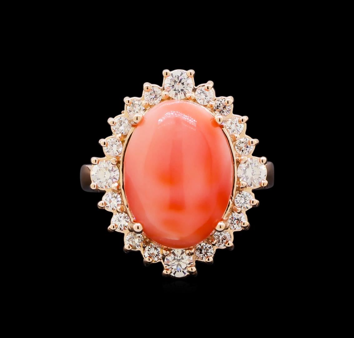 One electronically tested 14KT rose gold lady's cast fashion ring with a basket halo with a bright polish finish. The featured lady's ring has a shank measuring 2.85 millimeters in width. Identified with markings of "K14". Condition is new, good workmanship. Containing: One prong set oval cabochon cut natural pink coral, measuring 14.84 x 10.85 x 4.83mm, (depth est.) 20%. bulge factor, approximate weight of 8.10ct., orangy red color, (GIA oR 0/0), cut is good. The featured pink coral has a marbled pink and red appearance. Transmitting light diffusely, opaque to translucent. Colored gemstones are presumed to have been subjected to commonly used enhancement processes. Graded in the setting. Sixteen prong set round brilliant cut diamonds, measuring 2.10 - 2.00 x 1.29mm (depth est.) approximate total weight of 16 Stones = 0.58ct. Graded in the setting. Clarity: SI-1 to SI-2. Color: H - I. Cut Good Four prong set round brilliant cut diamonds, measuring 2.80 - 2.70 x 1.71mm (depth est.) approximate total weight of 4 Stones = 0.31ct. Graded in the setting. Clarity: VS-2 to SI-1. Color: H - I. Cut Very Good. Total Weight of Colored Stones 8.10ct. Total Weight of Diamonds 0.89ct. Total Weight of Ring 7.40gm. GAS Appraised at $3,390.00.
