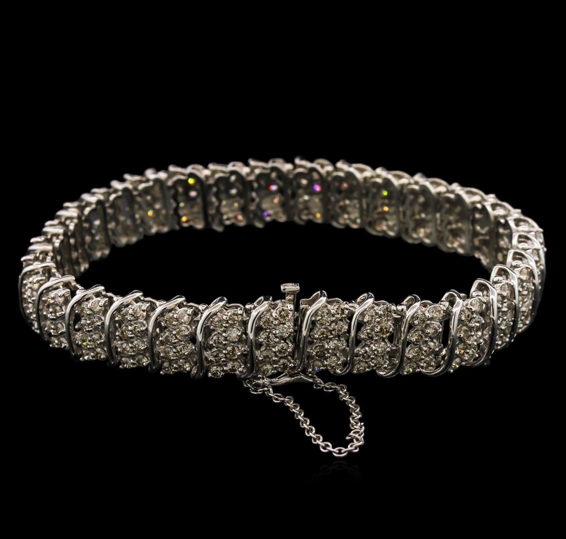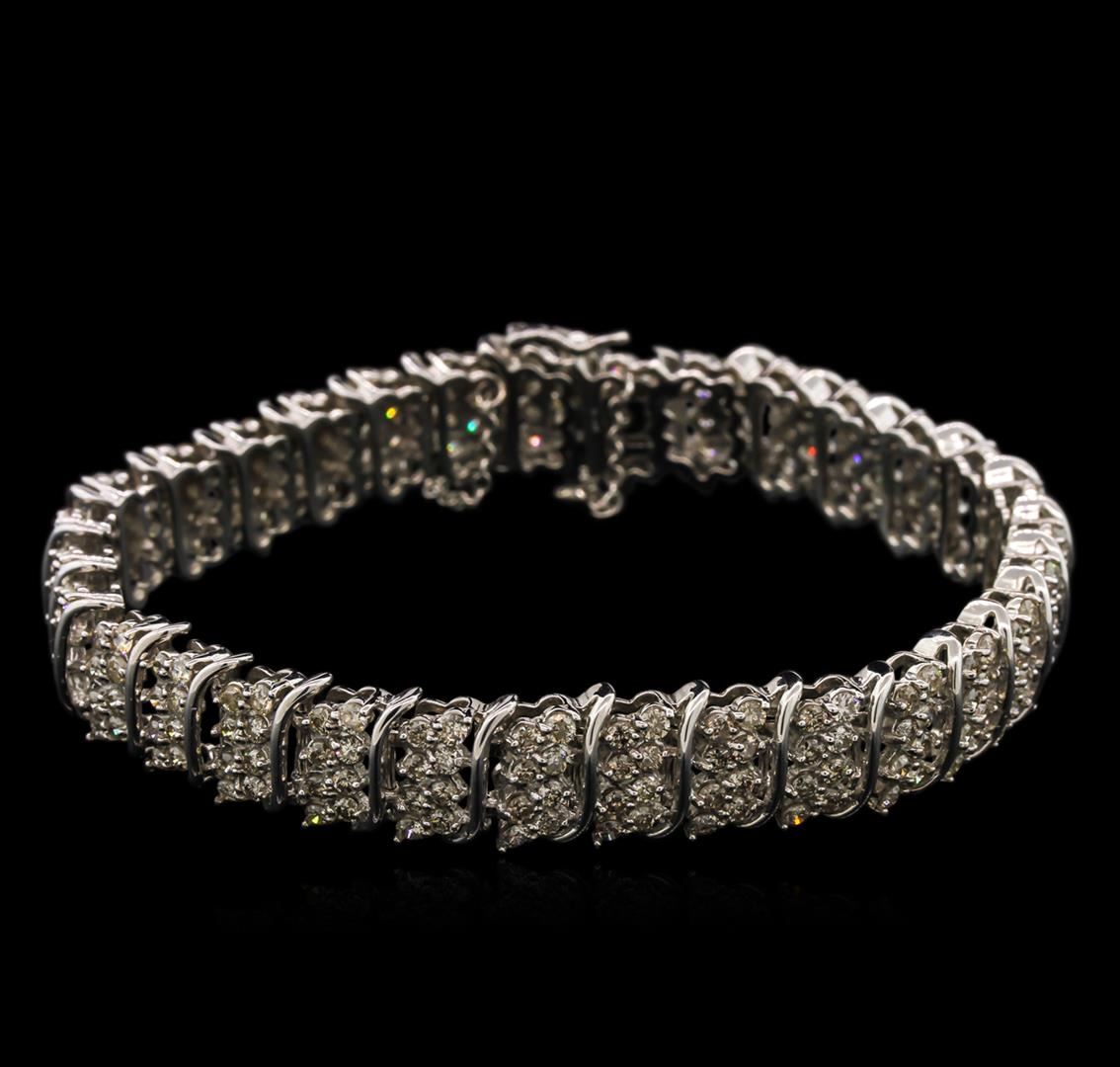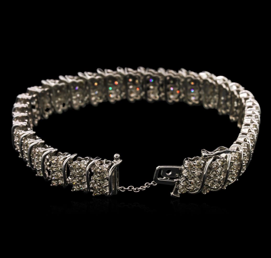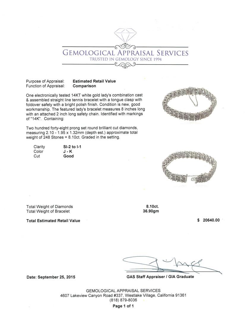 One electronically tested 14KT white gold lady's combination cast & assembled straight line tennis bracelet with a tongue clasp with foldover safety with a bright polish finish. The featured lady's bracelet measures 8 inches long with an attached 2 inch long safety chain. Identified with markings of "14K". Condition is new, good workmanship. Containing: Two Hundred Forty-Eight prong set round brilliant cut diamonds, measuring 2.10 - 1.95 x 1.32mm (depth est.) approximate total weight of 248 Stones = 8.10ct. Graded in the setting. Clarity: SI-2 to I-1. Color: J - Good. Total Weight of Diamonds 8.10ct. Total Weight of Bracelet 36.90gm at $20640.00.. GAS Appraised at $20,640.00.