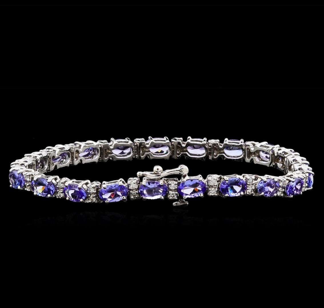One electronically tested 14KT white gold lady's combination cast & assembled fashion bracelet with a tongue clasp with foldover safety with a bright polish finish. The featured lady's bracelet measures approximately 7 inches in length. Identified with markings of "14K". Condition is new, good workmanship. Containing: Twenty-one prong set oval modified brilliant cut natural tanzanites, measuring 5.90 x 3.90 x 2.50mm, approximate total weight of 8.11ct., clarity is eye clean, type I, medium light, very slightly grayish, bluish violet color, (GIA bV 4/3), cut is good. Transmitting light with no distortion, transparent. Colored gemstones are presumed to have been subjected to commonly used enhancement processes. Graded in the setting. Forty-Two prong set round brilliant cut diamonds, measuring 1.60 - 1.55 x 1.00mm (depth est.) approximate total weight of 42 Stones = 0.65ct. Graded in the setting. Clarity: SI-1 to I-1. Color: H - I. Cut Good. Total Weight of Colored Stones 8.11ct. Total Weight of Diamonds 0.65ct. Total Weight of Bracelet 12.20gm. GAS Appraised at $7,280.00.
