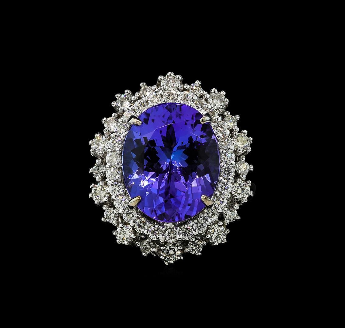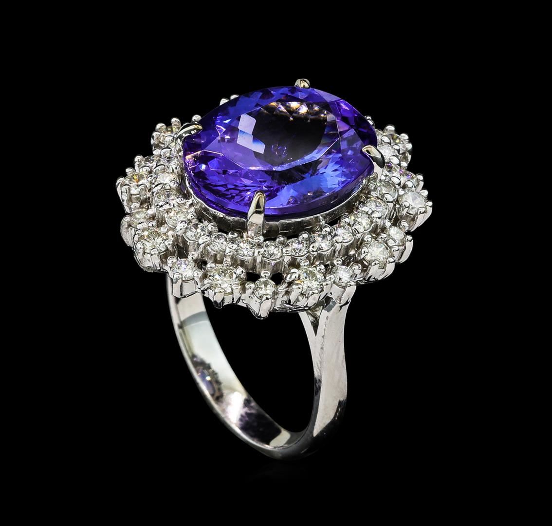 One electronically tested 14KT white gold lady's cast fashion ring with a double basket halo with a bright polish finish. The featured lady's ring has a shank measuring 2.90 millimeters wide. Identified with markings of 'K14'. Condition is new, good workmanship. Containing: One prong set oval modified brilliant cut natural tanzanite, measuring 14.10 x 11.38 x 7.42mm, (depth est.) approximate weight of 8.11ct., clarity is eye clean, medium, moderately strong, bluish violet color, (GIA bV 5/4), cut is very good. Transmitting light with no distortion, transparent. Colored gemstones are presumed to have been subjected to commonly used enhancement processes. Graded in the setting. Ten prong set round brilliant cut diamonds, measuring 2.30 - 2.20 x 1.35mm (depth est.) approximate total weight of 10 Stones = 0.41ct. Graded in the setting. Clarity SI-1 to I-1. Color: H - I Cut Good Thirty-Six prong set round brilliant cut diamonds, measuring 1.80 - 1.65 x 1.04mm (depth est.) approximate total weight of 36 Stones = 0.67ct. Graded in the setting. Clarity SI-1 to I-1. Color: G - H Cut Good. Total Weight of Colored Stones 8.11ct.. Total Weight of Diamonds 1.08ct.. Total Weight of Ring 8.80gm GAS Appraised at $16,300.00.