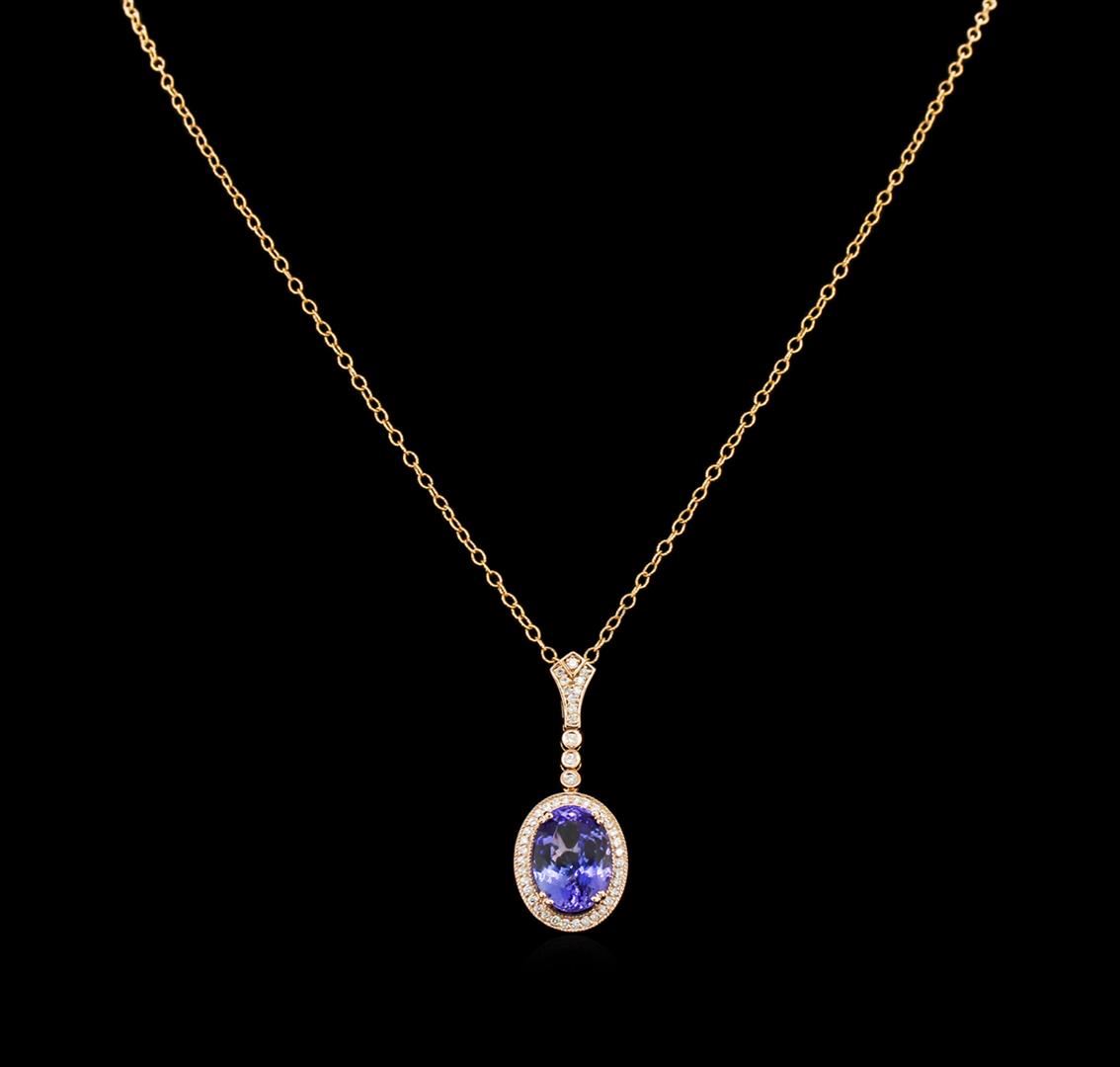 One electronically tested 14KT rose gold lady's combination cast & assembled fashion pendant & chain 18.0" long, 2mm oval cable link with a lobster claw clasp with a bright polish finish. Identified with markings of "K14". Condition is new, good workmanship. Containing: One prong set oval modified brilliant cut natural tanzanite, measuring 14.15 x 10.38 x 7.18mm, 10%. bulge factor, approximate weight of 8.12ct., clarity is eye clean, type I, medium, moderately strong, violetish blue color, (GIA vB 5/4), cut is very good. Transmitting light with no distortion, transparent. Colored gemstones are presumed to have been subjected to commonly used enhancement processes. Graded in the setting. Four bezel set round brilliant cut diamonds, measuring 1.70 - 1.65 x 1.06mm (depth est.) approximate total weight of 4 Stones = 0.08ct. Graded in the setting. Clarity: SI-1 to I-1. Color: H - I. Cut Good Forty-Three prong set round brilliant cut diamonds, measuring 1.30 - 1.25 x 0.81mm (depth est.) approximate total weight of 43 Stones = 0.36ct. Graded in the setting. Clarity: SI-1 to I-1. Color: H - I. Cut Good. Total Weight of Colored Stones 8.12ct. Total Weight of Diamonds 0.44ct. Total Weight of Pendant & Chain 7.60gm. GAS Appraised at $15,025.00.