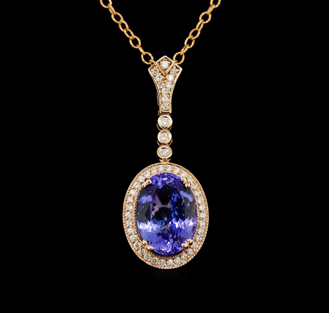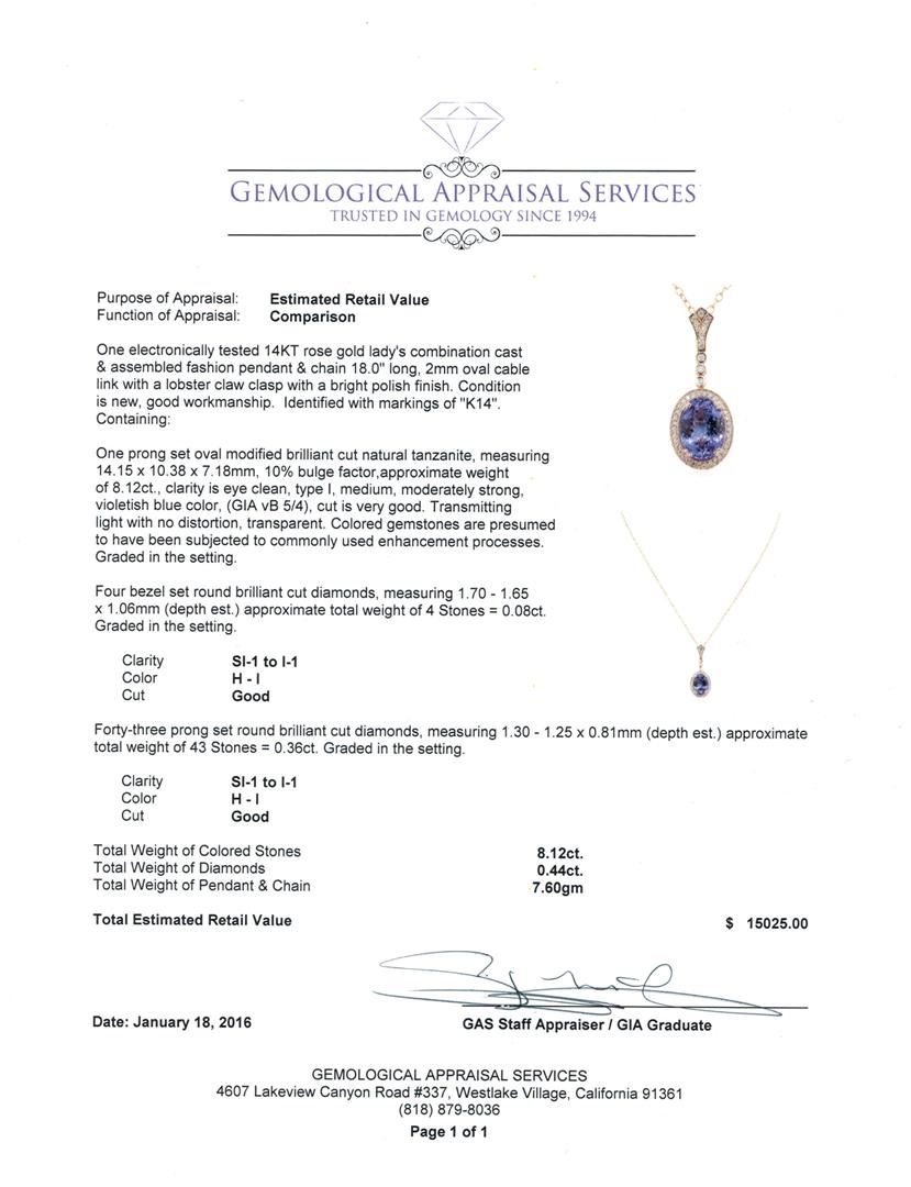 One electronically tested 14KT rose gold lady's combination cast & assembled fashion pendant & chain 18.0" long, 2mm oval cable link with a lobster claw clasp with a bright polish finish. Identified with markings of "K14". Condition is new, good workmanship. Containing: One prong set oval modified brilliant cut natural tanzanite, measuring 14.15 x 10.38 x 7.18mm, 10%. bulge factor, approximate weight of 8.12ct., clarity is eye clean, type I, medium, moderately strong, violetish blue color, (GIA vB 5/4), cut is very good. Transmitting light with no distortion, transparent. Colored gemstones are presumed to have been subjected to commonly used enhancement processes. Graded in the setting. Four bezel set round brilliant cut diamonds, measuring 1.70 - 1.65 x 1.06mm (depth est.) approximate total weight of 4 Stones = 0.08ct. Graded in the setting. Clarity: SI-1 to I-1. Color: H - I. Cut Good Forty-Three prong set round brilliant cut diamonds, measuring 1.30 - 1.25 x 0.81mm (depth est.) approximate total weight of 43 Stones = 0.36ct. Graded in the setting. Clarity: SI-1 to I-1. Color: H - I. Cut Good. Total Weight of Colored Stones 8.12ct. Total Weight of Diamonds 0.44ct. Total Weight of Pendant & Chain 7.60gm. GAS Appraised at $15,025.00.