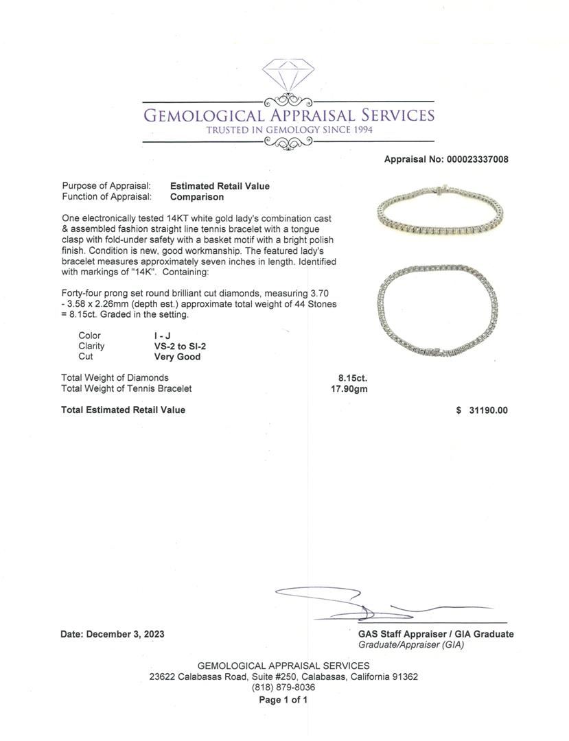 One new 8.15 ctw Diamond Tennis Bracelet - 14KT White Gold. Appraisal Value: $31190. See appraisal for full details.