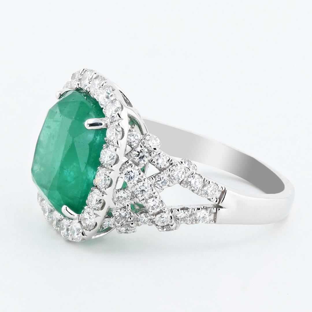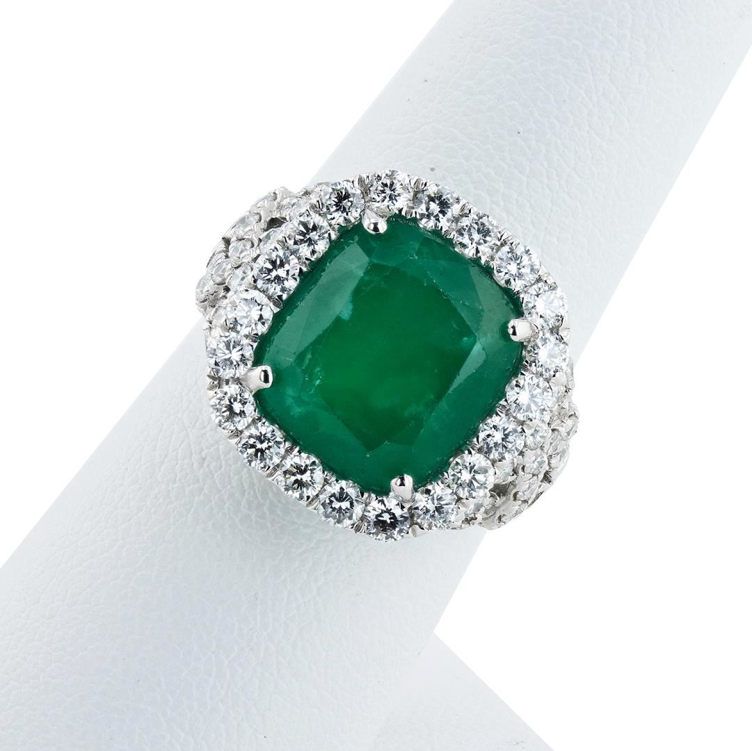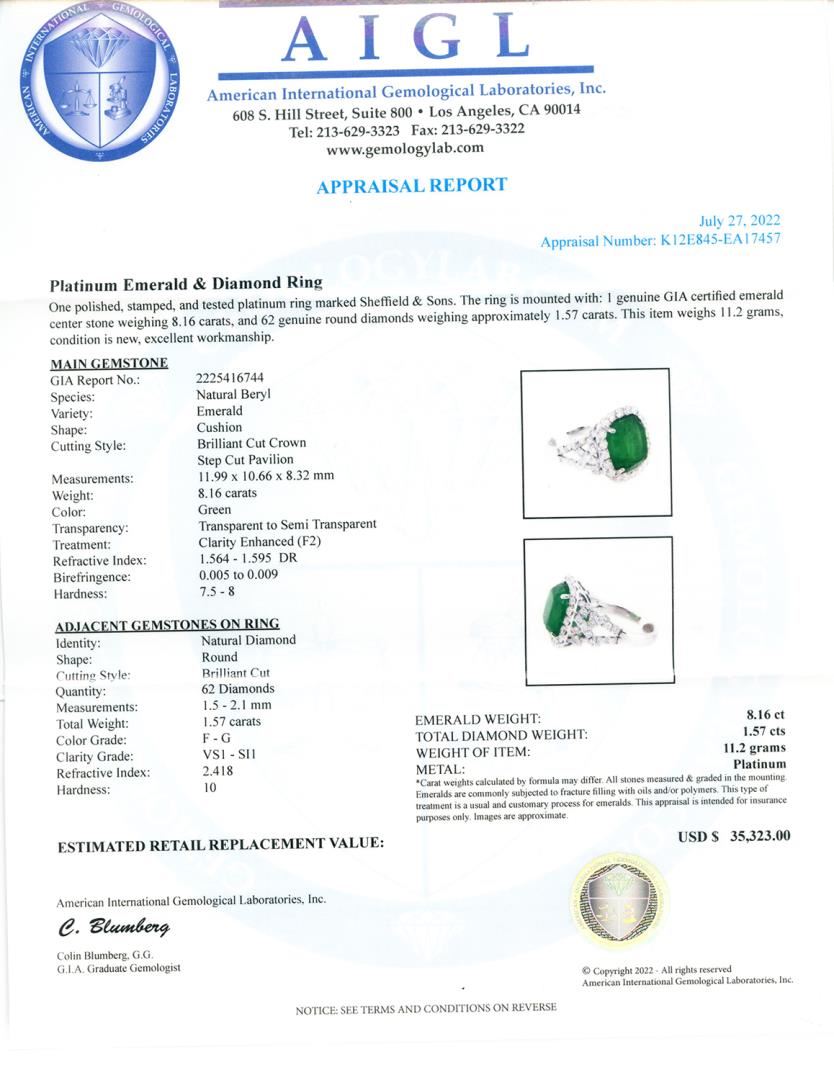 One polished, stamped, and tested platinum ring marked Sheffield and Sons. The ring is mounted with: 1 genuine GIA certified emerald center tone weighing 8.16 carats, and 62 genuine round diamonds weighing approximately 1.57 carats. This item weighs 11.2 grams, condition is new, excellent workmanship. #MAIN GEMSTONE# GIA Report No. 2225416744 Species: Natural Beryl Variety: Emerald Shape: Cushion Cutting Style: Brillant Cut Crown, Step Cut Pavilion Measurements: 11.99 x 10.66 x 8.32mm Weight: 8.16 carats Color: Green Transparency: Transparent to Semi Transparent Treament: Clarity Enhanced (F2) Refractive Index: 1.564 - 1.595 DR Birefringence: 0.005 to 0.009 Hardness: 7.5 - 8 #ADJACENT GEMSTONES ON RING# Identity: Natural Diamond Shape: Round Cutting Style: Brillant Cut Quantity: 62 Diamonds Measurements: 1.5 - 2.1mm Total Weight: 1.57 carats Color Grade: F - G Clarity Grade: VS1 - SI1 Refractive Index: 2.418 Hardness: 10 EMERALD WEIGHT: 8.16ct TOTAL DIAMOND WEIGHT: 1.57 cts WEIGHT OF ITEM: 11.2 grams METAL: Platinum #LREF-12845