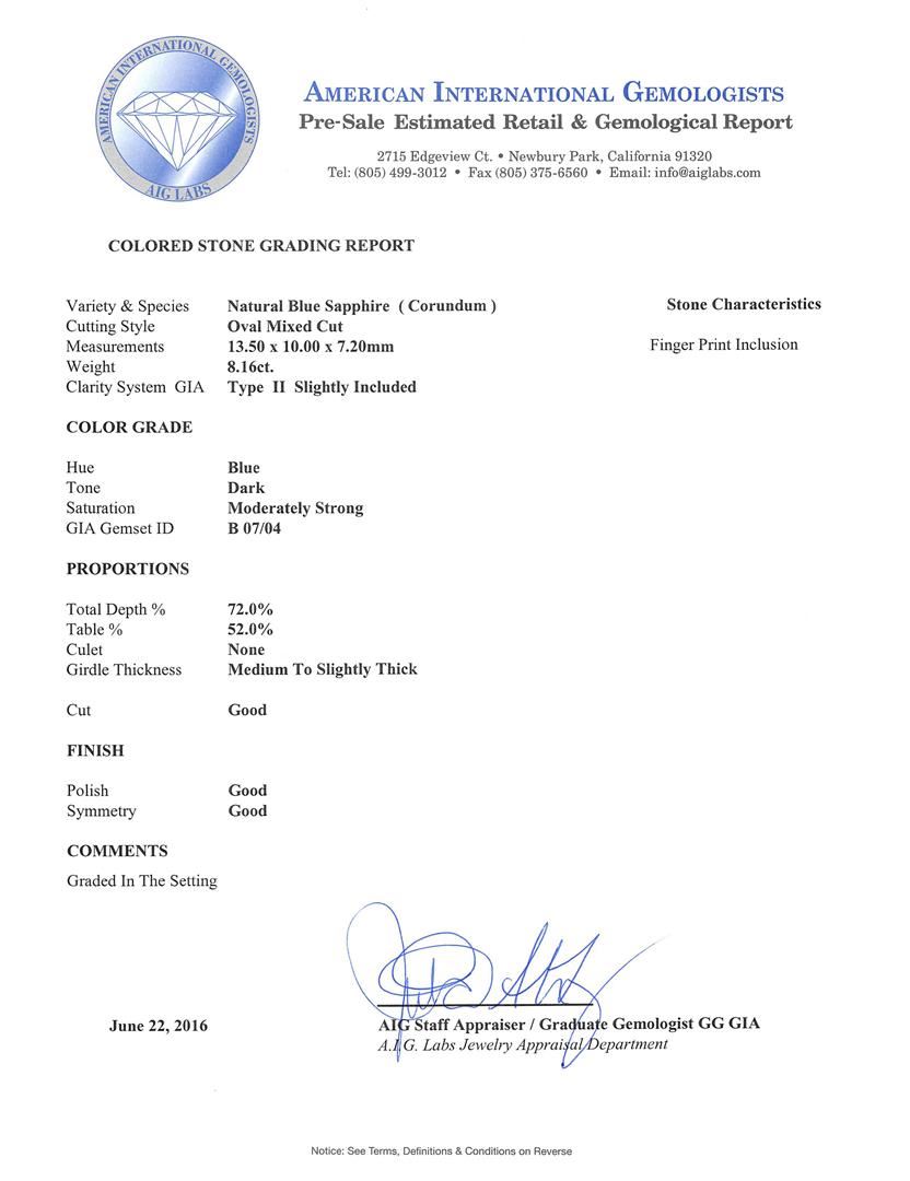 One electronically tested 18KT white gold ladies cast sapphire and diamond ring. The featured sapphire is set within a wrapping diamond set curvature accented by a curving ribbon of yellow diamonds supported by tapering diamond set shoulders, completed by a seven millimeter wide diamond studded band. Bright and patterned finish with yellow gold accents. Condition is good. Containing: One prong set oval mixed cut natural blue sapphire, measuring 13.50 x 10.00. x 7.20mm, approximate weight of 8.16ct., clarity is slightly included, type II, dark, moderately strong, blue color, (GIA B 7/4), cut is good. Transmitting light with a minimum of distortion, transparent. Naturally occurring internal & external characteristics are present. Graded in the setting. Ninety-Three prong set round brilliant cut diamonds, measuring 1.70 - 1.20 x 0.87mm (depth est.) approximate total weight of 93 Stones = 1.10ct. Indications of laboratory irradiated enhanced color. Color grade is an average for the group. Graded in the setting. Clarity: SI-1 to I-1 One Hundred Fifty-Four prong set round brilliant cut diamonds, measuring 1.70 - 1.40 x 0.93mm (depth est.) approximate total weight of 154 Stones = 2.19ct. Graded in the setting. Clarity: VS-1 to SI-1 . Color: F - H. Total Weight of Colored Stones 8.16ct.. Total Weight of Diamonds 3.29ct.. Total Weight of Ring 16.64gm. AIG Appraised at $33,860.00.