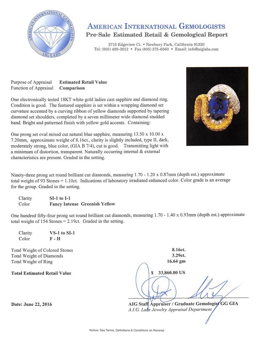 One electronically tested 18KT white gold ladies cast sapphire and diamond ring. The featured sapphire is set within a wrapping diamond set curvature accented by a curving ribbon of yellow diamonds supported by tapering diamond set shoulders, completed by a seven millimeter wide diamond studded band. Bright and patterned finish with yellow gold accents. Condition is good. Containing: One prong set oval mixed cut natural blue sapphire, measuring 13.50 x 10.00. x 7.20mm, approximate weight of 8.16ct., clarity is slightly included, type II, dark, moderately strong, blue color, (GIA B 7/4), cut is good. Transmitting light with a minimum of distortion, transparent. Naturally occurring internal & external characteristics are present. Graded in the setting. Ninety-Three prong set round brilliant cut diamonds, measuring 1.70 - 1.20 x 0.87mm (depth est.) approximate total weight of 93 Stones = 1.10ct. Indications of laboratory irradiated enhanced color. Color grade is an average for the group. Graded in the setting. Clarity: SI-1 to I-1 One Hundred Fifty-Four prong set round brilliant cut diamonds, measuring 1.70 - 1.40 x 0.93mm (depth est.) approximate total weight of 154 Stones = 2.19ct. Graded in the setting. Clarity: VS-1 to SI-1 . Color: F - H. Total Weight of Colored Stones 8.16ct.. Total Weight of Diamonds 3.29ct.. Total Weight of Ring 16.64gm. AIG Appraised at $33,860.00.