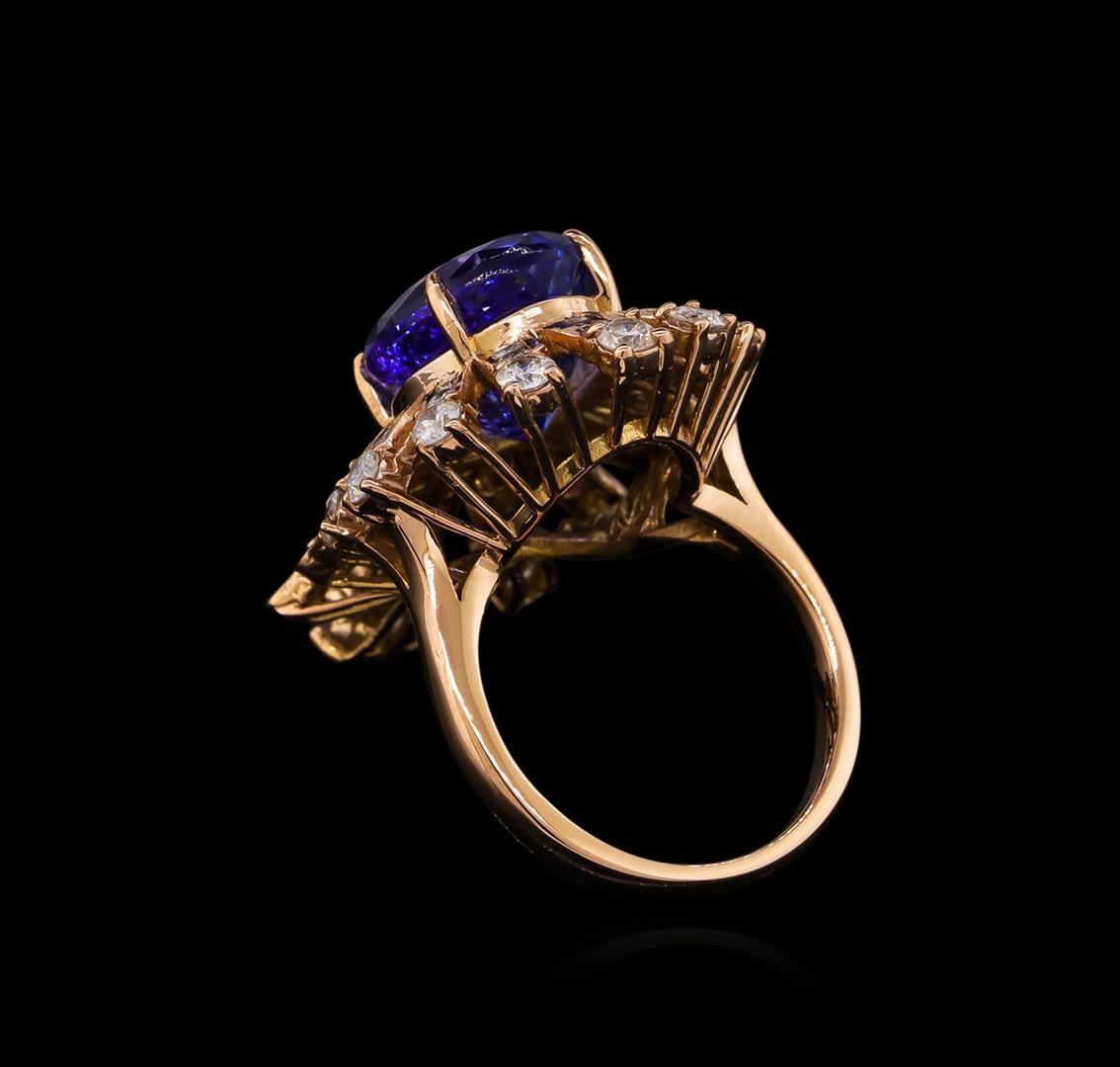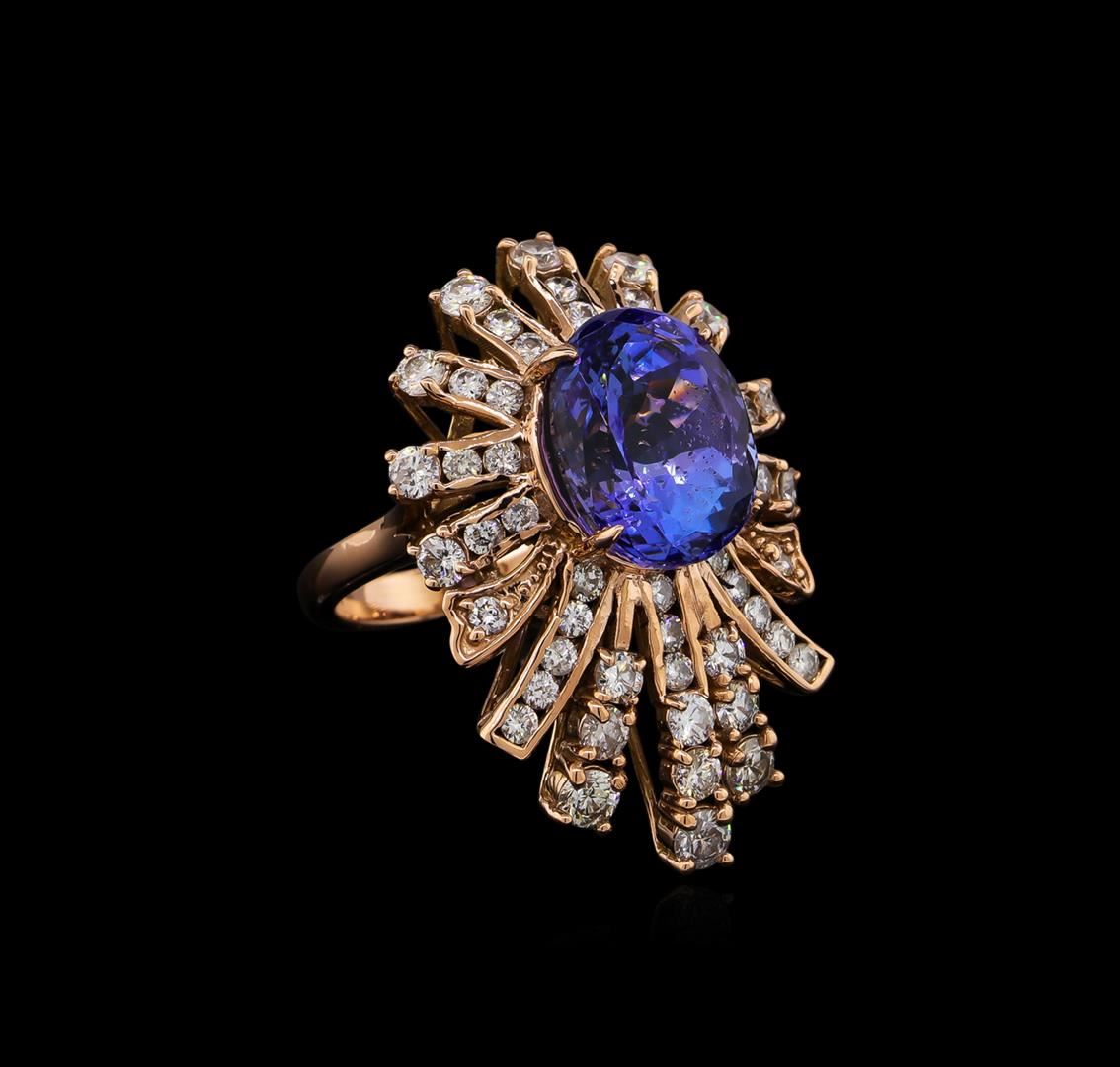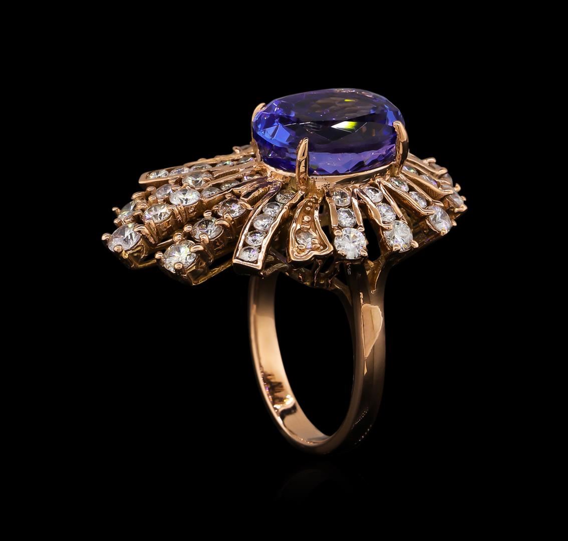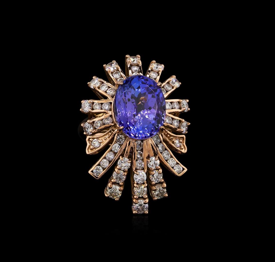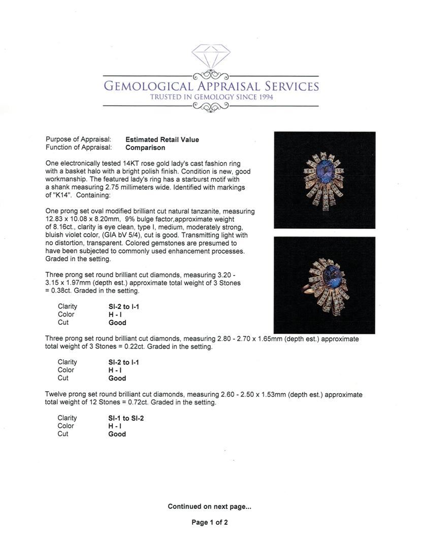 One electronically tested 14KT rose gold lady's cast fashion ring with a basket halo with a bright polish finish. The featured lady's ring has a starburst motif with a shank measuring 2.75 millimeters wide. Identified with markings of "K14". Condition is new, good workmanship. Containing: One prong set oval modified brilliant cut natural tanzanite, measuring 12.83 x 10.08 x 8.20mm, 9%. bulge factor, approximate weight of 8.16ct., clarity is eye clean, type I, medium, moderately strong, bluish violet color, (GIA bV 5/4), cut is good. Transmitting light with no distortion, transparent. Colored gemstones are presumed to have been subjected to commonly used enhancement processes. Graded in the setting. Three prong set round brilliant cut diamonds, measuring 3.20 - 3.15 x 1.97mm (depth est.) approximate total weight of 3 Stones = 0.38ct. Graded in the setting. Clarity: SI-2 to I-1. Color: H - I. Cut Good Three prong set round brilliant cut diamonds, measuring 2.80 - 2.70 x 1.65mm (depth est.) approximate total weight of 3 Stones = 0.22ct. Graded in the setting. Clarity: SI-2 to I-1. Color: H - I. Cut Good Twelve prong set round brilliant cut diamonds, measuring 2.60 - 2.50 x 1.53mm (depth est.) approximate total weight of 12 Stones = 0.72ct. Graded in the setting. Clarity: SI-1 to SI-2. Color: H - I. Cut Good Two prong set round brilliant cut diamonds, measuring 2.10 - 2.00 x 1.27mm (depth est.) approximate total weight of 2 Stones = 0.06ct. Graded in the setting. Clarity: SI-2. Color: H - I. Cut Good Thirty-One channel set round brilliant cut diamonds, measuring 1.90 - 1.80 x 1.15mm (depth est.) approximate total weight of 31 Stones = 0.74ct. Graded in the setting. Clarity: SI-1 to I-1. Color: H - I. Cut Good. Total Weight of Colored Stones 8.16ct. Total Weight of Diamonds 2.12ct. Total Weight of Ring 10.90gm GAS Appraised.
