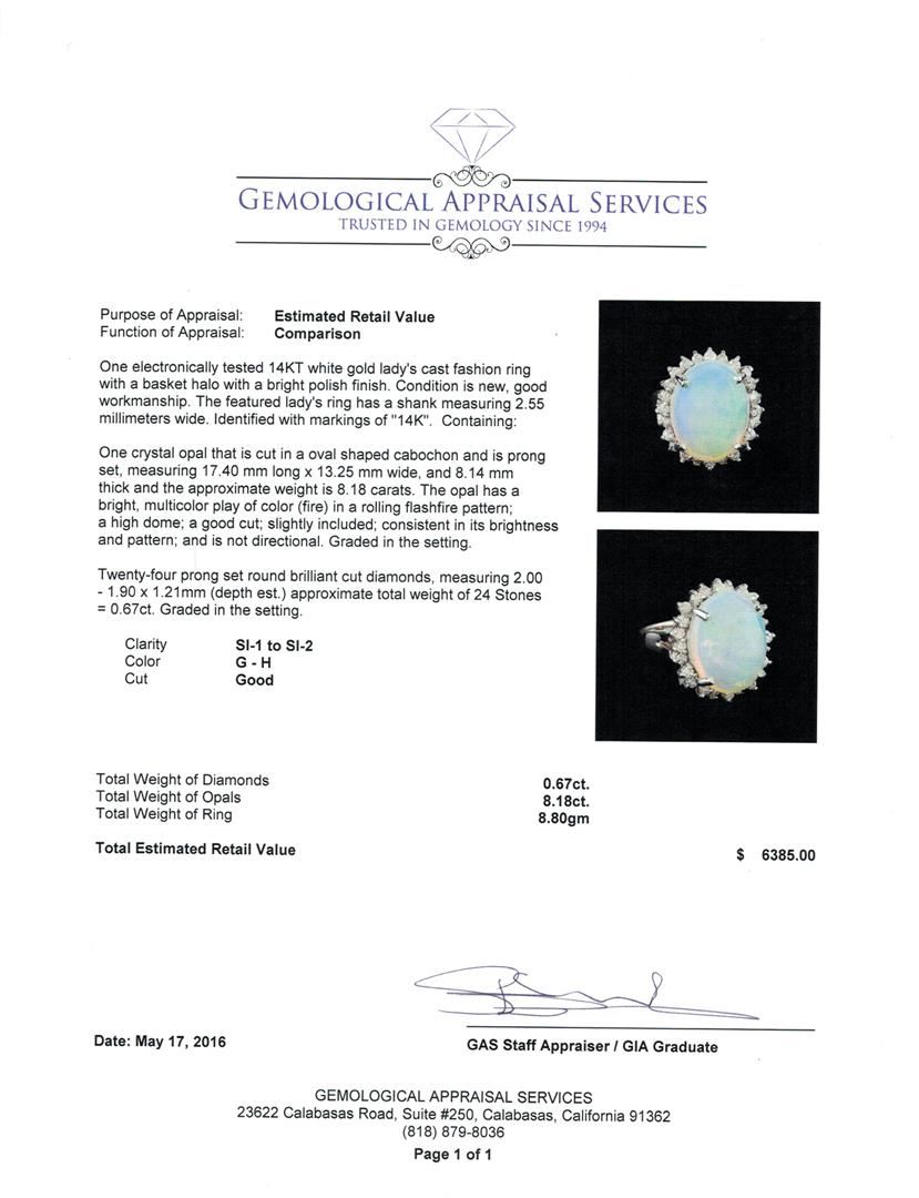 One electronically tested 14KT white gold lady's cast fashion ring with a basket halo with a bright polish finish. The featured lady's ring has a shank measuring 2.55 millimeters wide. Identified with markings of "14K". Condition is new, good workmanship. Containing: One crystal opal that is cut in a oval shaped cabochon and is prong set, measuring 17.40 mm long x 13.25 mm wide, and 8.14 mm thick and the approximate weight is 8.18 carats. The opal has a bright, multicolor play of color (fire) in a rolling flashfire pattern; a high dome; a good cut; slightly included; consistent in its brightness and pattern; and is not directional. Graded in the setting. Twenty-Four prong set round brilliant cut diamonds, measuring 2.00 - 1.90 x 1.21mm (depth est.) approximate total weight of 24 Stones = 0.67ct. Graded in the setting. Clarity: SI-1 to SI-2. Color: G - Good. Total Weight of Diamonds 0.67ct. Total Weight of Opals 8.18ct. Total Weight of Ring 8.80gm. GAS Appraised at $6,385.00.