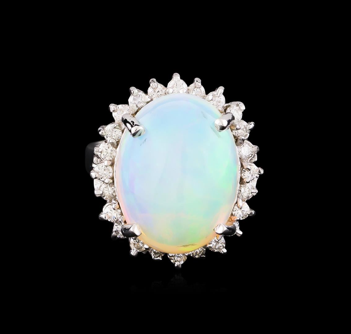 One electronically tested 14KT white gold lady's cast fashion ring with a basket halo with a bright polish finish. The featured lady's ring has a shank measuring 2.55 millimeters wide. Identified with markings of "14K". Condition is new, good workmanship. Containing: One crystal opal that is cut in a oval shaped cabochon and is prong set, measuring 17.40 mm long x 13.25 mm wide, and 8.14 mm thick and the approximate weight is 8.18 carats. The opal has a bright, multicolor play of color (fire) in a rolling flashfire pattern; a high dome; a good cut; slightly included; consistent in its brightness and pattern; and is not directional. Graded in the setting. Twenty-Four prong set round brilliant cut diamonds, measuring 2.00 - 1.90 x 1.21mm (depth est.) approximate total weight of 24 Stones = 0.67ct. Graded in the setting. Clarity: SI-1 to SI-2. Color: G - Good. Total Weight of Diamonds 0.67ct. Total Weight of Opals 8.18ct. Total Weight of Ring 8.80gm. GAS Appraised.