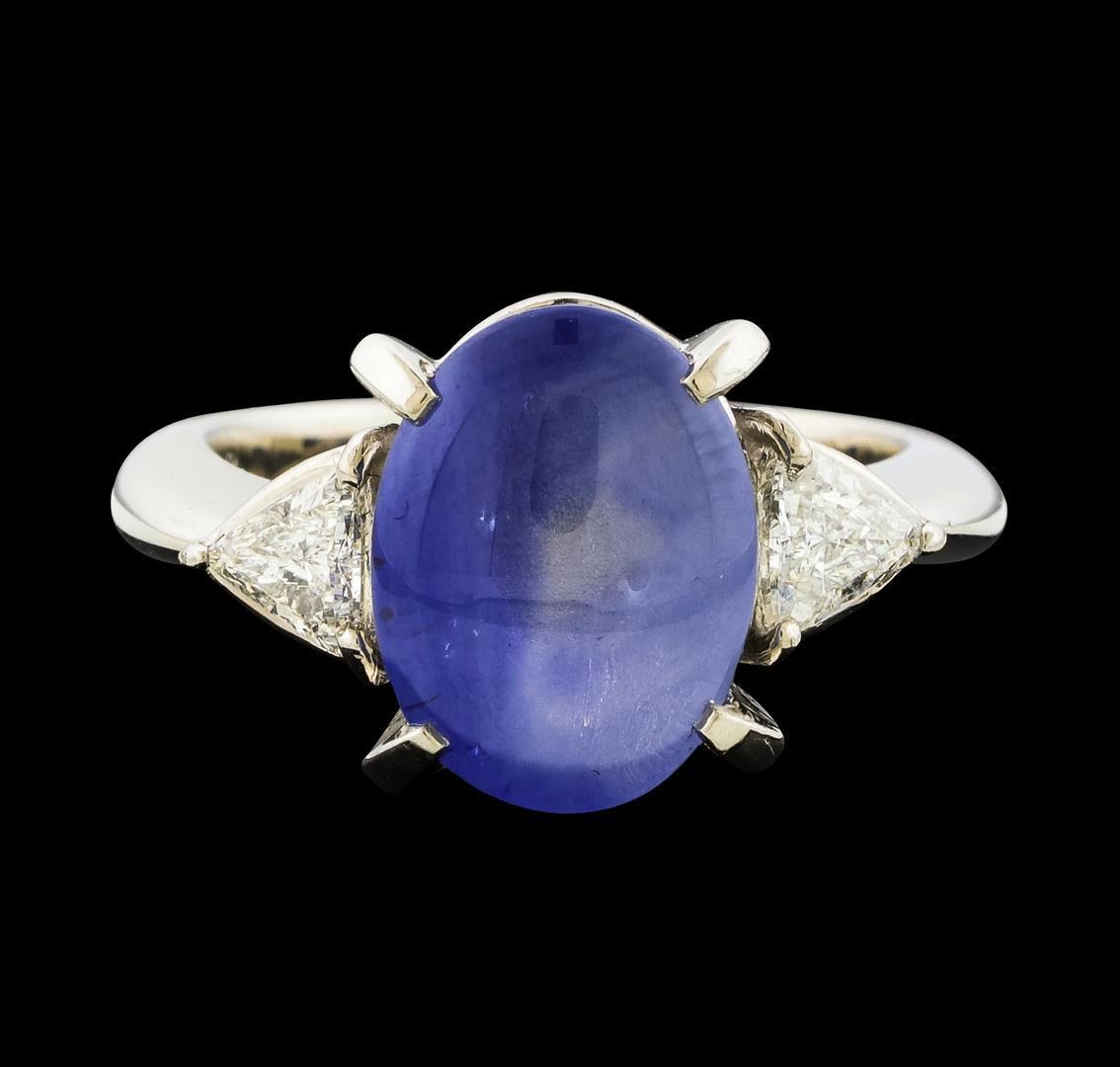 One ring featuring: Platinum containing Star Sapphire with a total weight of 8.18ct and Diamonds with a total weight of 0.38ct. Total Weight of Ring: 11.5 grams.