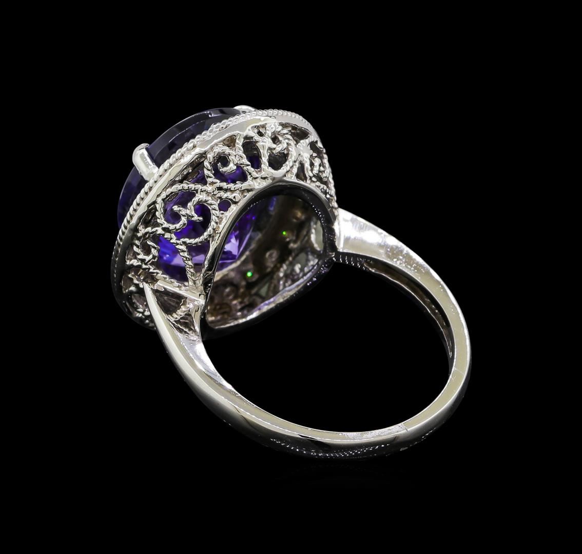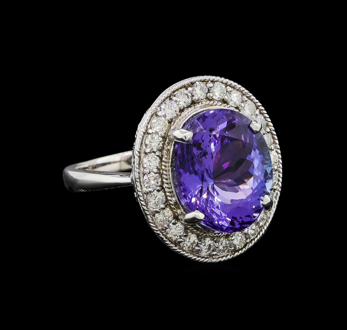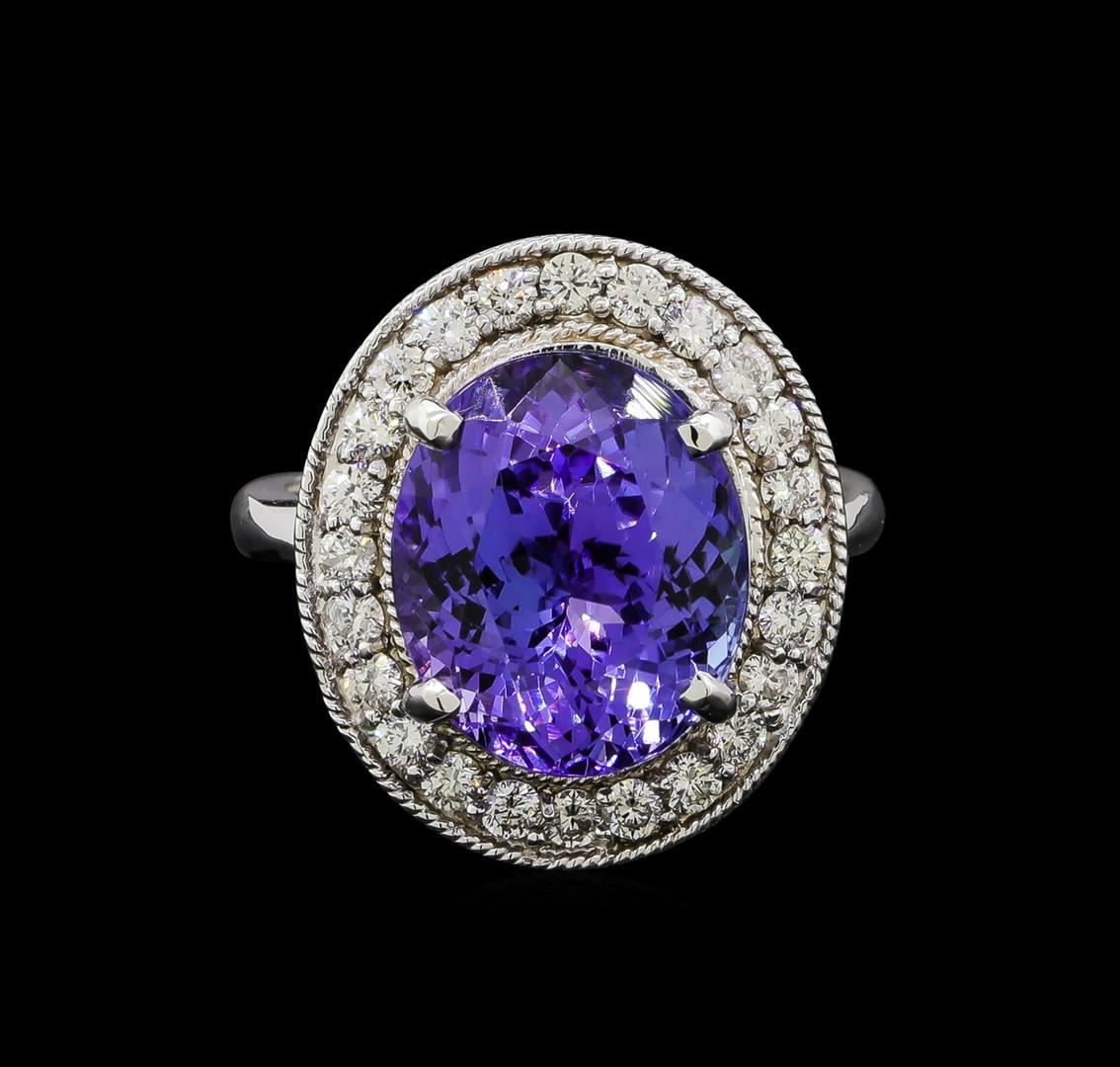 One electronically tested 14KT white gold lady's cast fashion ring with a basket halo with a bright polish with milgrain detailing finish. The featured lady's ring has a shank measuring 2.07 millimeters wide. Identified with markings of 'K14'. Condition is new, good workmanship. Containing: One prong set oval modified brilliant cut natural tanzanite, measuring 13.10 x 11.00 x 8.00mm, (depth est.) approximate weight of 8.18ct., clarity is eye clean, medium, moderately strong, bluish violet color, (GIA bV 5/4), cut is good. Transmitting light with no distortion, transparent. Colored gemstones are presumed to have been subjected to commonly used enhancement processes. Graded in the setting. Twenty-Four prong set round brilliant cut diamonds, measuring 2.00 - 1.90 x 1.19mm (depth est.) approximate total weight of 24 Stones = 0.67ct. Graded in the setting. Clarity SI-1 to SI-2. Color: H - I Cut Good. Total Weight of Colored Stones 8.18ct.. Total Weight of Diamonds 0.67ct.. Total Weight of Ring 7.60gm GAS Appraised at $14,825.00.
