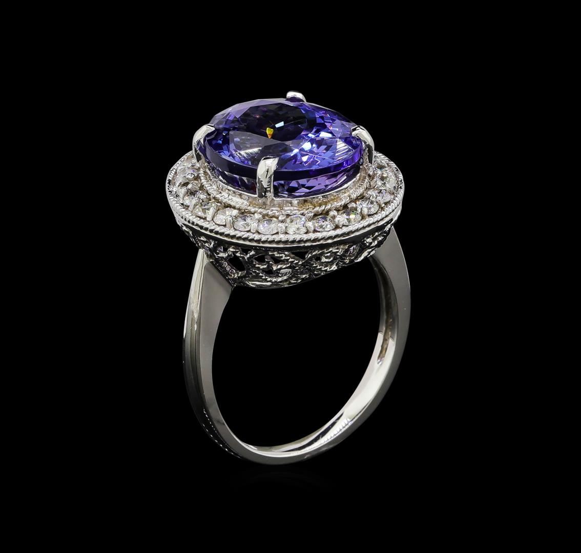 One electronically tested 14KT white gold lady's cast fashion ring with a basket halo with a bright polish with milgrain detailing finish. The featured lady's ring has a shank measuring 2.07 millimeters wide. Identified with markings of 'K14'. Condition is new, good workmanship. Containing: One prong set oval modified brilliant cut natural tanzanite, measuring 13.10 x 11.00 x 8.00mm, (depth est.) approximate weight of 8.18ct., clarity is eye clean, medium, moderately strong, bluish violet color, (GIA bV 5/4), cut is good. Transmitting light with no distortion, transparent. Colored gemstones are presumed to have been subjected to commonly used enhancement processes. Graded in the setting. Twenty-Four prong set round brilliant cut diamonds, measuring 2.00 - 1.90 x 1.19mm (depth est.) approximate total weight of 24 Stones = 0.67ct. Graded in the setting. Clarity SI-1 to SI-2. Color: H - I Cut Good. Total Weight of Colored Stones 8.18ct.. Total Weight of Diamonds 0.67ct.. Total Weight of Ring 7.60gm GAS Appraised at $14,825.00.