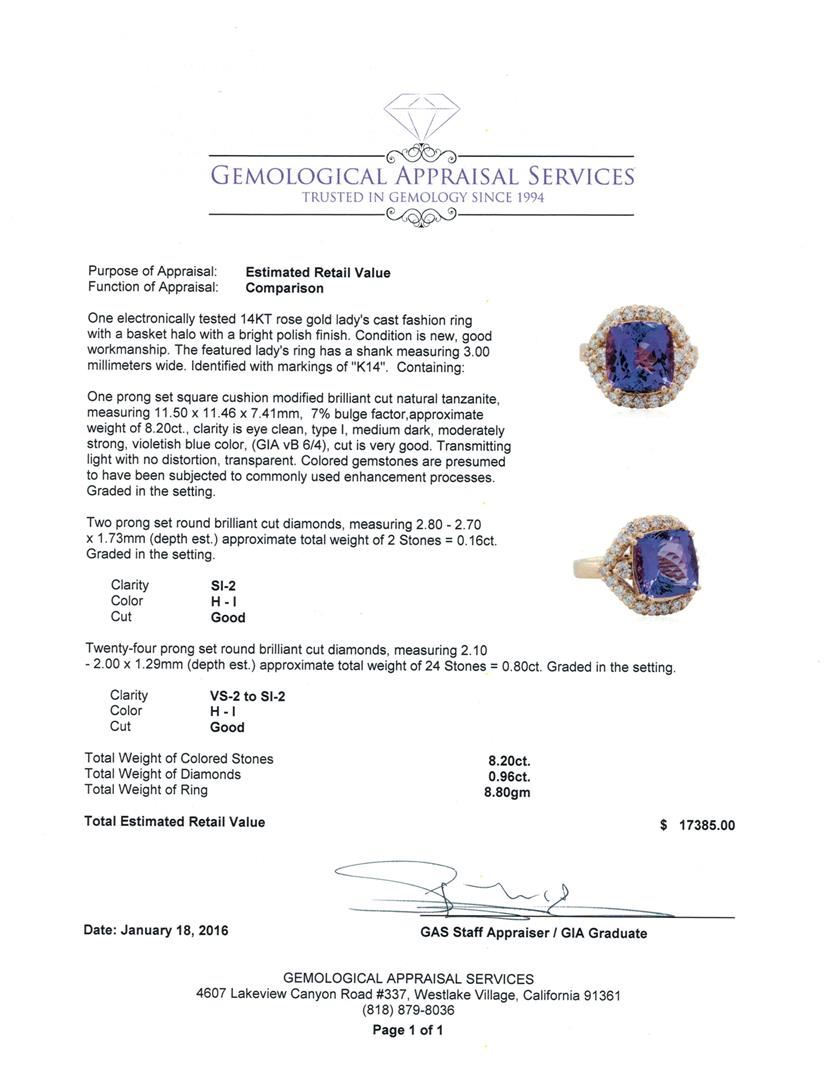One electronically tested 14KT rose gold lady's cast fashion ring with a basket halo with a bright polish finish. The featured lady's ring has a shank measuring 3.00 millimeters wide. Identified with markings of "K14". Condition is new, good workmanship. Containing: One prong set square cushion modified brilliant cut natural tanzanite, measuring 11.50 x 11.46 x 7.41mm, 7%. bulge factor, approximate weight of 8.20ct., clarity is eye clean, type I, medium dark, moderately strong, violetish blue color, (GIA vB 6/4), cut is very good. Transmitting light with no distortion, transparent. Colored gemstones are presumed to have been subjected to commonly used enhancement processes. Graded in the setting. Two prong set round brilliant cut diamonds, measuring 2.80 - 2.70 x 1.73mm (depth est.) approximate total weight of 2 Stones = 0.16ct. Graded in the setting. Clarity: SI-2. Color: H - I. Cut Good Twenty-Four prong set round brilliant cut diamonds, measuring 2.10 - 2.00 x 1.29mm (depth est.) approximate total weight of 24 Stones = 0.80ct. Graded in the setting. Clarity: VS-2 to SI-2. Color: H - I. Cut Good. Total Weight of Colored Stones 8.20ct. Total Weight of Diamonds 0.96ct. Total Weight of Ring 8.80gm. GAS Appraised at $17,385.00.