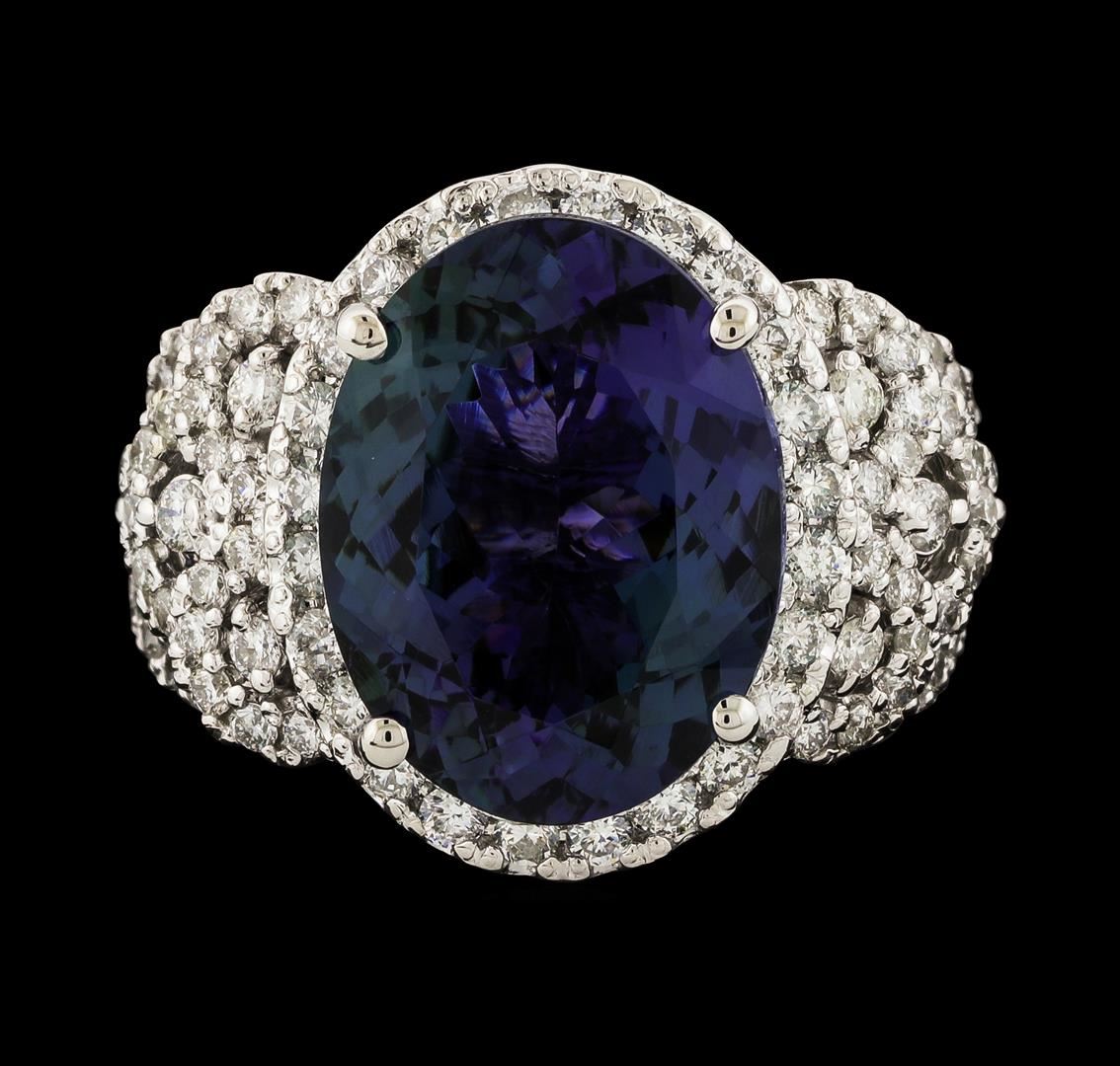 One electronically tested 14KT white gold lady's cast fashion ring with a split cathedral shank with a halo with a bright polish finish. The featured lady's ring has tiered and scalloped diamond encrusted shoulders and a split double shank measuring 7.28 millimeters wide. Identified with markings of 'K14'. Condition is new, good workmanship. Containing: One prong set oval modified brilliant cut natural tanzanite, measuring 14.85 x 11.39 x 6.58mm, (depth est.) 5%. bulge factor, approximate weight of 8.23ct., clarity is eye clean, medium dark, slightly grayish, violet color, (GIA V 6/2), cut is good. Transmitting light with no distortion, transparent. Colored gemstones are presumed to have been subjected to commonly used enhancement processes. Graded in the setting. Two prong set round brilliant cut diamonds, measuring 2.40 - 2.30 x 1.46mm (depth est.) approximate total weight of 2 Stones = 0.10ct. Graded in the setting. Clarity SI-1. Color: G - H Cut Good Thirty prong set round brilliant cut diamonds, measuring 1.70 - 1.60 x 1.02mm (depth est.) approximate total weight of 30 Stones = 0.50ct. Graded in the setting. Clarity SI-1 to SI-2. Color: G - H Cut Good Fifty-Six prong set round brilliant cut diamonds, measuring 1.50 - 1.35 x 0.89mm (depth est.) approximate total weight of 56 Stones = 0.62ct. Graded in the setting. Clarity SI-1 to SI-2. Color: G - H Cut Good. Total Weight of Colored Stones 8.23ct.. Total Weight of Diamonds 1.22ct.. Total Weight of Ring 10.30gm GAS Appraised at $12,275.00.