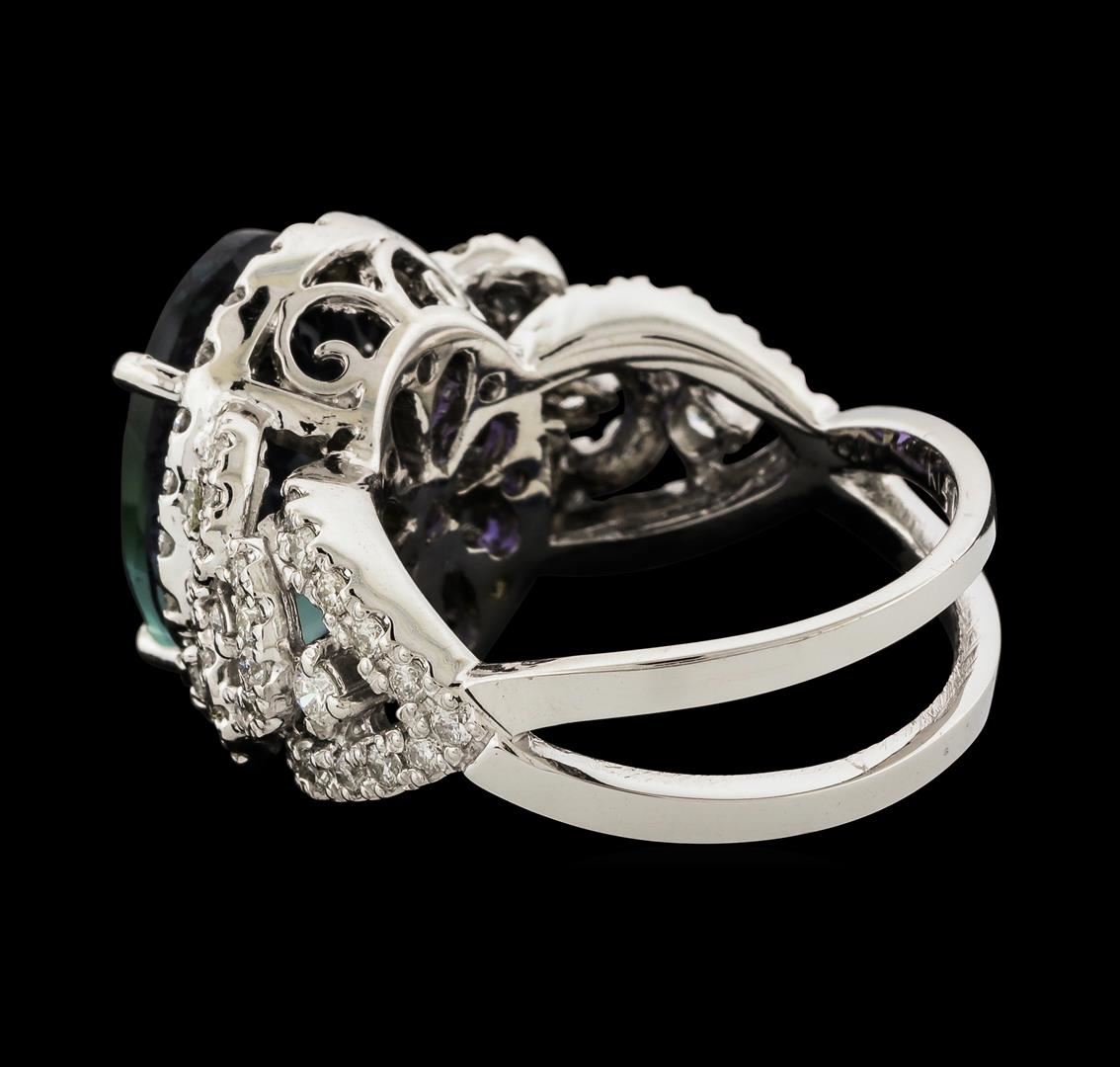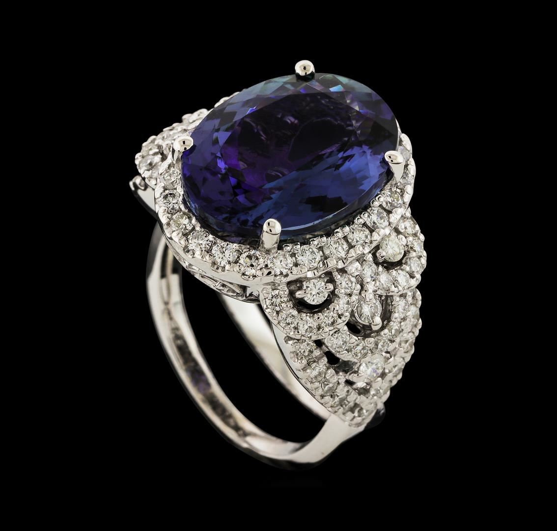 One electronically tested 14KT white gold lady's cast fashion ring with a split cathedral shank with a halo with a bright polish finish. The featured lady's ring has tiered and scalloped diamond encrusted shoulders and a split double shank measuring 7.28 millimeters wide. Identified with markings of 'K14'. Condition is new, good workmanship. Containing: One prong set oval modified brilliant cut natural tanzanite, measuring 14.85 x 11.39 x 6.58mm, (depth est.) 5%. bulge factor, approximate weight of 8.23ct., clarity is eye clean, medium dark, slightly grayish, violet color, (GIA V 6/2), cut is good. Transmitting light with no distortion, transparent. Colored gemstones are presumed to have been subjected to commonly used enhancement processes. Graded in the setting. Two prong set round brilliant cut diamonds, measuring 2.40 - 2.30 x 1.46mm (depth est.) approximate total weight of 2 Stones = 0.10ct. Graded in the setting. Clarity SI-1. Color: G - H Cut Good Thirty prong set round brilliant cut diamonds, measuring 1.70 - 1.60 x 1.02mm (depth est.) approximate total weight of 30 Stones = 0.50ct. Graded in the setting. Clarity SI-1 to SI-2. Color: G - H Cut Good Fifty-Six prong set round brilliant cut diamonds, measuring 1.50 - 1.35 x 0.89mm (depth est.) approximate total weight of 56 Stones = 0.62ct. Graded in the setting. Clarity SI-1 to SI-2. Color: G - H Cut Good. Total Weight of Colored Stones 8.23ct.. Total Weight of Diamonds 1.22ct.. Total Weight of Ring 10.30gm GAS Appraised at $12,275.00.