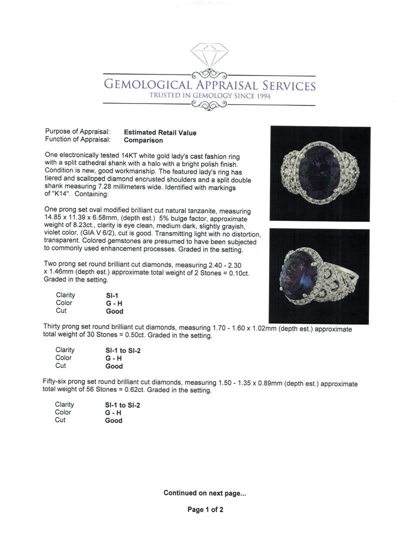One electronically tested 14KT white gold lady's cast fashion ring with a split cathedral shank with a halo with a bright polish finish. The featured lady's ring has tiered and scalloped diamond encrusted shoulders and a split double shank measuring 7.28 millimeters wide. Identified with markings of 'K14'. Condition is new, good workmanship. Containing: One prong set oval modified brilliant cut natural tanzanite, measuring 14.85 x 11.39 x 6.58mm, (depth est.) 5%. bulge factor, approximate weight of 8.23ct., clarity is eye clean, medium dark, slightly grayish, violet color, (GIA V 6/2), cut is good. Transmitting light with no distortion, transparent. Colored gemstones are presumed to have been subjected to commonly used enhancement processes. Graded in the setting. Two prong set round brilliant cut diamonds, measuring 2.40 - 2.30 x 1.46mm (depth est.) approximate total weight of 2 Stones = 0.10ct. Graded in the setting. Clarity SI-1. Color: G - H Cut Good Thirty prong set round brilliant cut diamonds, measuring 1.70 - 1.60 x 1.02mm (depth est.) approximate total weight of 30 Stones = 0.50ct. Graded in the setting. Clarity SI-1 to SI-2. Color: G - H Cut Good Fifty-Six prong set round brilliant cut diamonds, measuring 1.50 - 1.35 x 0.89mm (depth est.) approximate total weight of 56 Stones = 0.62ct. Graded in the setting. Clarity SI-1 to SI-2. Color: G - H Cut Good. Total Weight of Colored Stones 8.23ct.. Total Weight of Diamonds 1.22ct.. Total Weight of Ring 10.30gm GAS Appraised at $12,275.00.