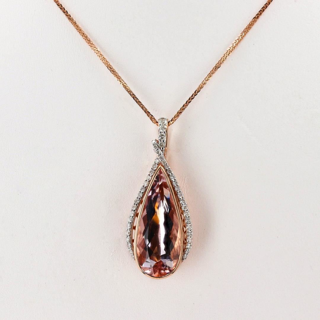 Fourteen karat (14K) two tone gold natural morganite beryl and diamond pendant with chain. A pear brilliant cut natural morganite beryl gemstone is mounted in the center of the pendant. Round brilliant cut diamonds accent the pendant around the center gemstone. The pendant and chain have a gross weight of 8.1 Grams. #NATURAL GEMSTONE# GEMSTONE: Morganite Beryl NATURE: Natural SHAPE: Pear Brilliant, Faceted Cut WEIGHT: 8.24 carat total DIMENSIONS: 24.21 x 10.30mm CLARITY: Type 1 COLOR: Pinkish Orange "Peach" (5/5) SYMMETRY: Excellent COLOR INTENSITY: Intense TRANSPARENCY: Transparent TONE: Dark #NATURAL DIAMOND# SHAPE: Round Brilliant Cut WEIGHT: 0.45 carat total (42pcs.) DIMENSIONS: 2.0 x 1.0mm AVERAGE CLARITY: SI1-SI2 AVERAGE COLOR: G-H SYMMETRY: Excellent POLISH: Excellent #METAL# METAL: Gold PURITY: 14K COLOR: Two Tone (Rose & White) CONDITION: Excellent FINISH: High Polish #LREF-3552