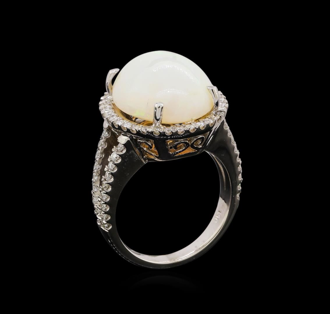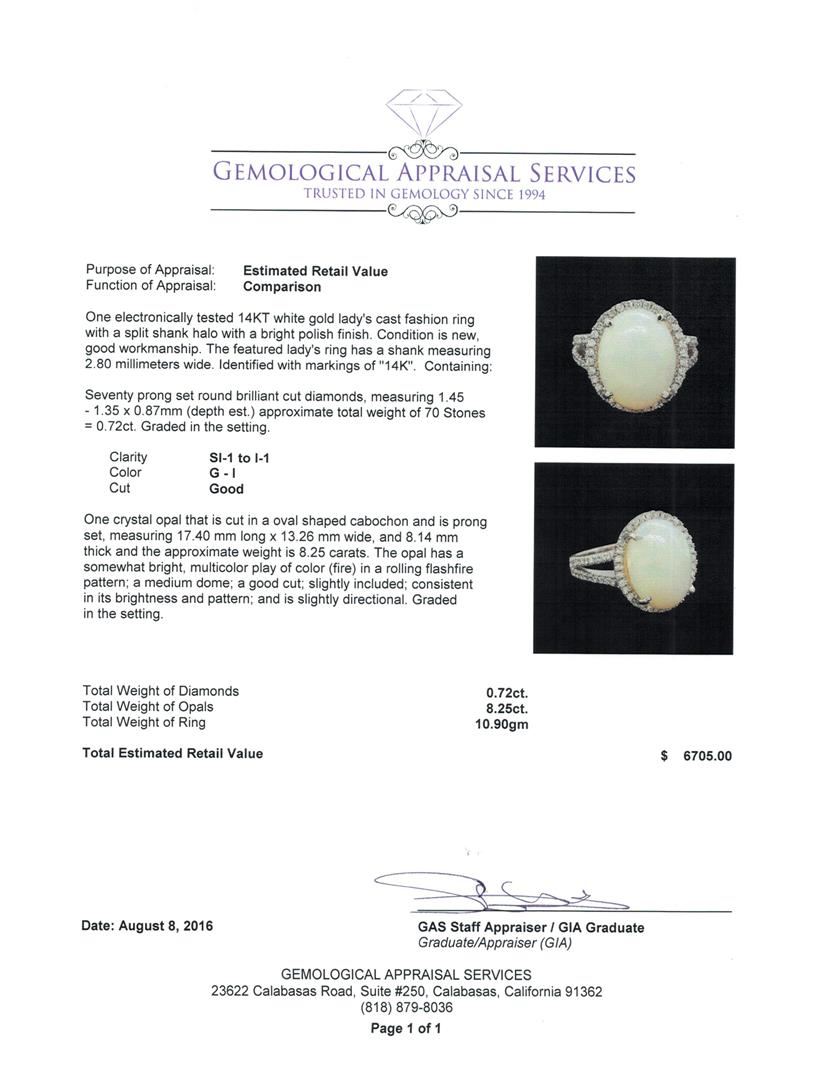 One electronically tested 14KT white gold lady's cast fashion ring with a split shank halo with a bright polish finish. The featured lady's ring has a shank measuring 2.80 millimeters wide. Identified with markings of '14K'. Condition is new, good workmanship. Containing: Seventy prong set round brilliant cut diamonds, measuring 1.45 - 1.35 x 0.87mm (depth est.) approximate total weight of 70 Stones = 0.72ct. Graded in the setting. Clarity SI-1 to I-1. Color: G - I Cut Good One crystal opal that is cut in a oval shaped cabochon and is prong set, measuring 17.40 mm long x 13.26 mm wide, and 8.14 mm thick and the approximate weight is 8.25 carats. The opal has a somewhat bright, multicolor play of color (fire) in a rolling flashfire pattern; a medium dome; a good cut; slightly included; consistent in its brightness and pattern; and is slightly directional. Graded in the setting.. Total Weight of Diamonds 0.72ct.. Total Weight of Opals 8.25ct.. Total Weight of Ring 10.90gm. GAS Appraised at $6,705.00.