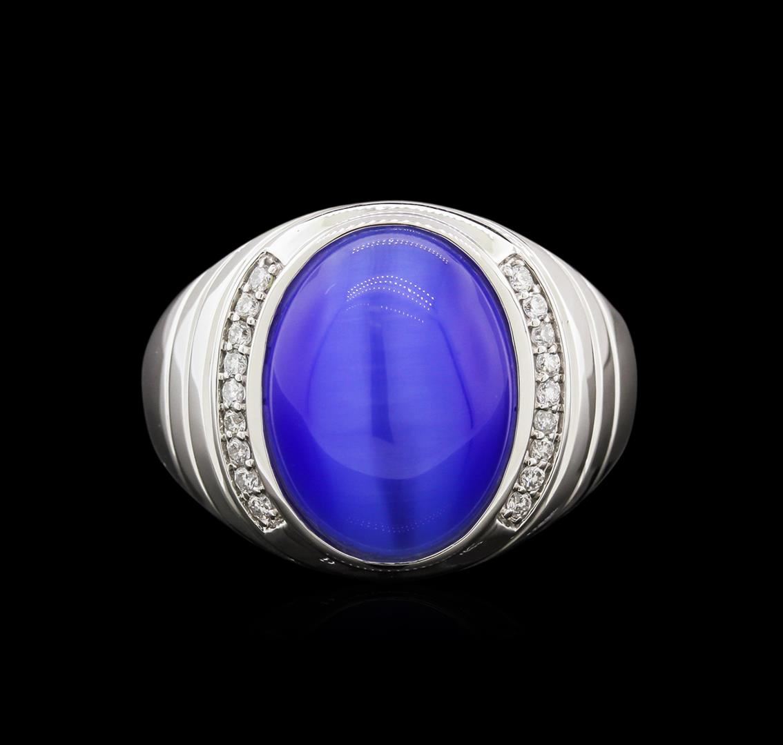 One ring featuring: 14KT white gold weighing 9.00 grams containing one blue tiger eye center stone with a total weight of 8.25ct and diamonds with a total weight of 0.22ct.