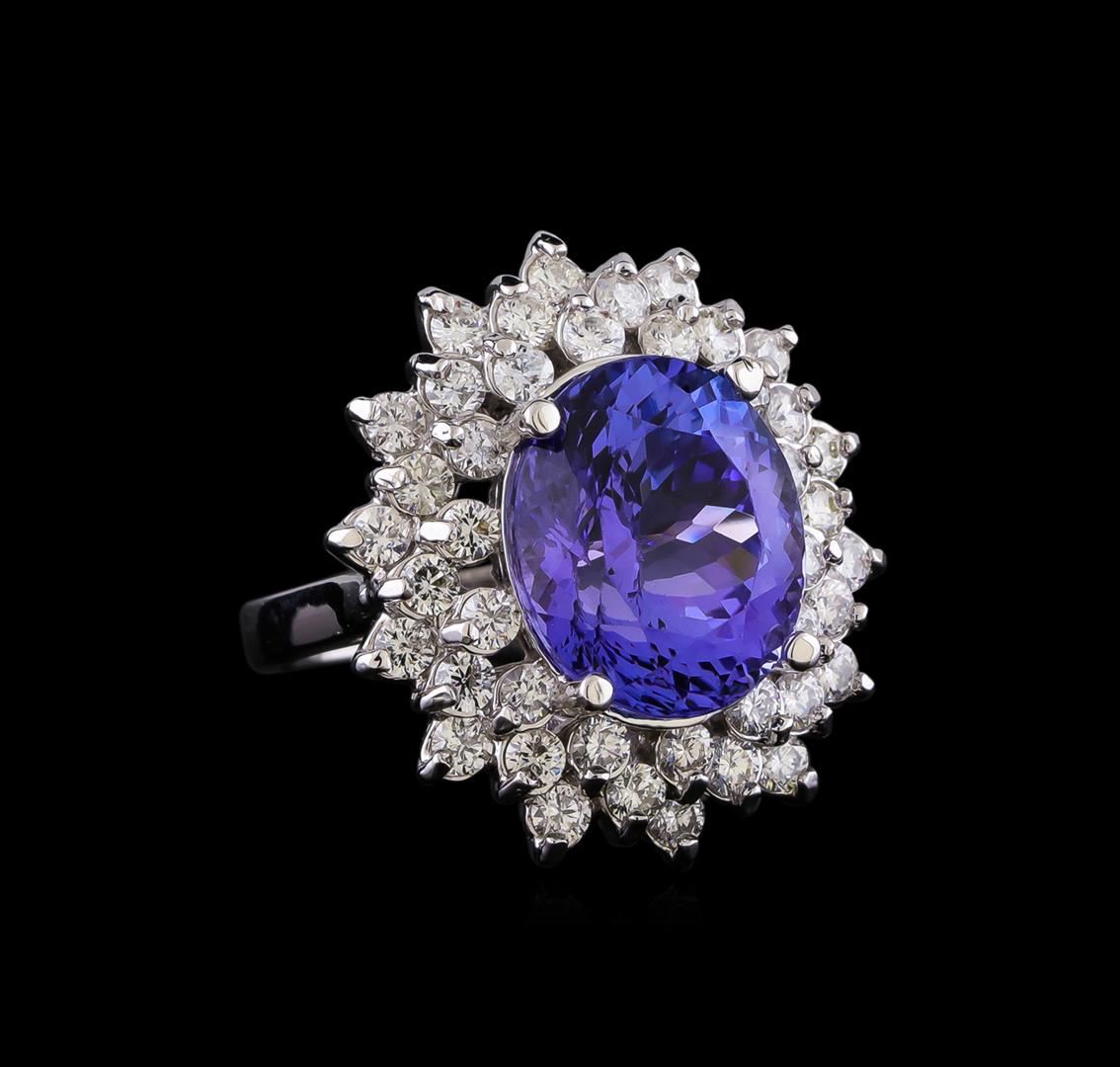 One electronically tested 14KT white gold lady's cast fashion ring with a double basket halo with a bright polish finish. The featured lady's has a shank measuring 2.65 millimeters in width. Identified with markings of "K14". Condition is new, good workmanship. Containing: One prong set oval modified brilliant cut natural tanzanite, measuring 13.25 x 11.13 x 8.23mm, (depth est.) approximate weight of 8.26ct., clarity is eye clean, medium, moderately strong, violetish blue color, (GIA vB 5/4), cut is very good. Transmitting light with no distortion, transparent. Colored gemstones are presumed to have been subjected to commonly used enhancement processes. Graded in the setting. Forty-Two prong set round brilliant cut diamonds, measuring 2.25 - 2.20 x 1.38mm (depth est.) approximate total weight of 42 Stones = 1.75ct. Graded in the setting. Clarity: SI-1 to SI-2. Color: G - I. Cut Good. Total Weight of Colored Stones 8.26ct. Total Weight of Diamonds 1.75ct. Total Weight of Ring 9.50gm. GAS Appraised.