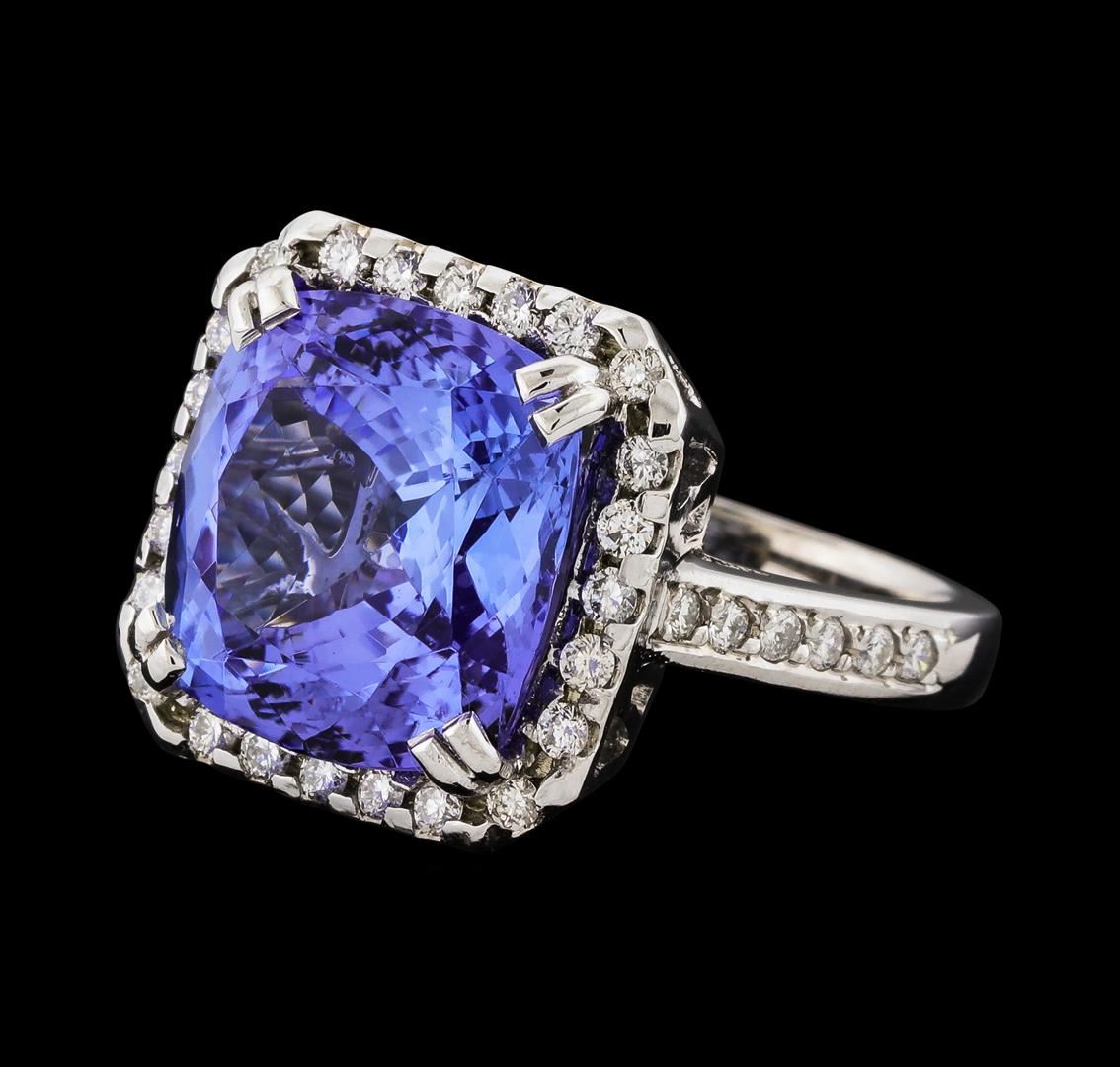One electronically tested 14KT white gold lady's cast fashion ring with a cathedral cushion halo with a bright polish finish. The featured lady's ring has a shank measuring 2.67 millimeters wide. Identified with markings of '14K'. Condition is new, good workmanship. Containing: One prong set square cushion modified brilliant cut natural tanzanite, measuring 12.12 x 12.02 x 7.36mm, (depth est.) approximate weight of 8.27ct., clarity is eye clean, medium, moderately strong, violet color, (GIA V 5/4), cut is very good. Transmitting light with no distortion, transparent. Colored gemstones are presumed to have been subjected to commonly used enhancement processes. Graded in the setting. Twenty-Four prong set round brilliant cut diamonds, measuring 1.60 - 1.55 x 0.98mm (depth est.) approximate total weight of 24 Stones = 0.35ct. Graded in the setting. Clarity SI-1 to SI-2. Color: G - H Cut Good Twelve prong set round brilliant cut diamonds, measuring 1.50 - 1.45 x 0.92mm (depth est.) approximate total weight of 12 Stones = 0.15ct. Graded in the setting. Clarity SI-1 to SI-2. Color: G - H Cut Good. Total Weight of Colored Stones 8.27ct.. Total Weight of Diamonds 0.50ct.. Total Weight of Ring 6.80gm. GAS Appraised at $11,925.00.