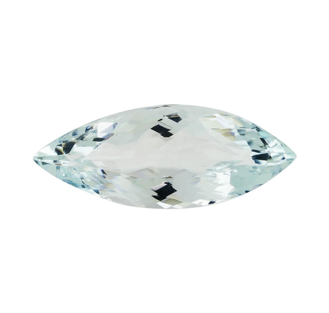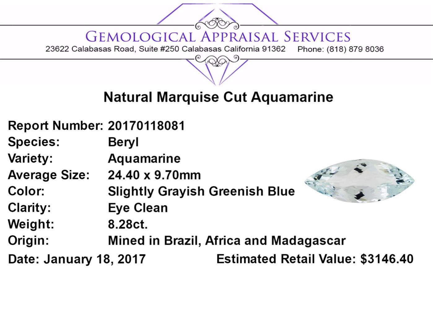 One natural marquise cut aquamarine with an exact weight of 8.28ct., clarity is eye clean, slightly grayish greenish blue. Gemological Appraisals Services estimates the retail value at $3146.4 GAS Appraised.