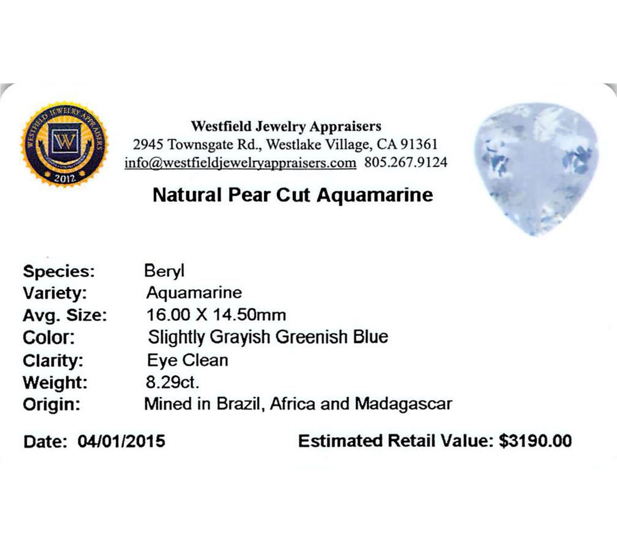 One pear cut natural aquamarine exact weight 8.29ct., clarity is eye clean, type I, medium, very slightly grayish, very slightly greenish blue color, (GIA vslgB 5/3), cut is good. Westfield Appraised at $3,190.00.