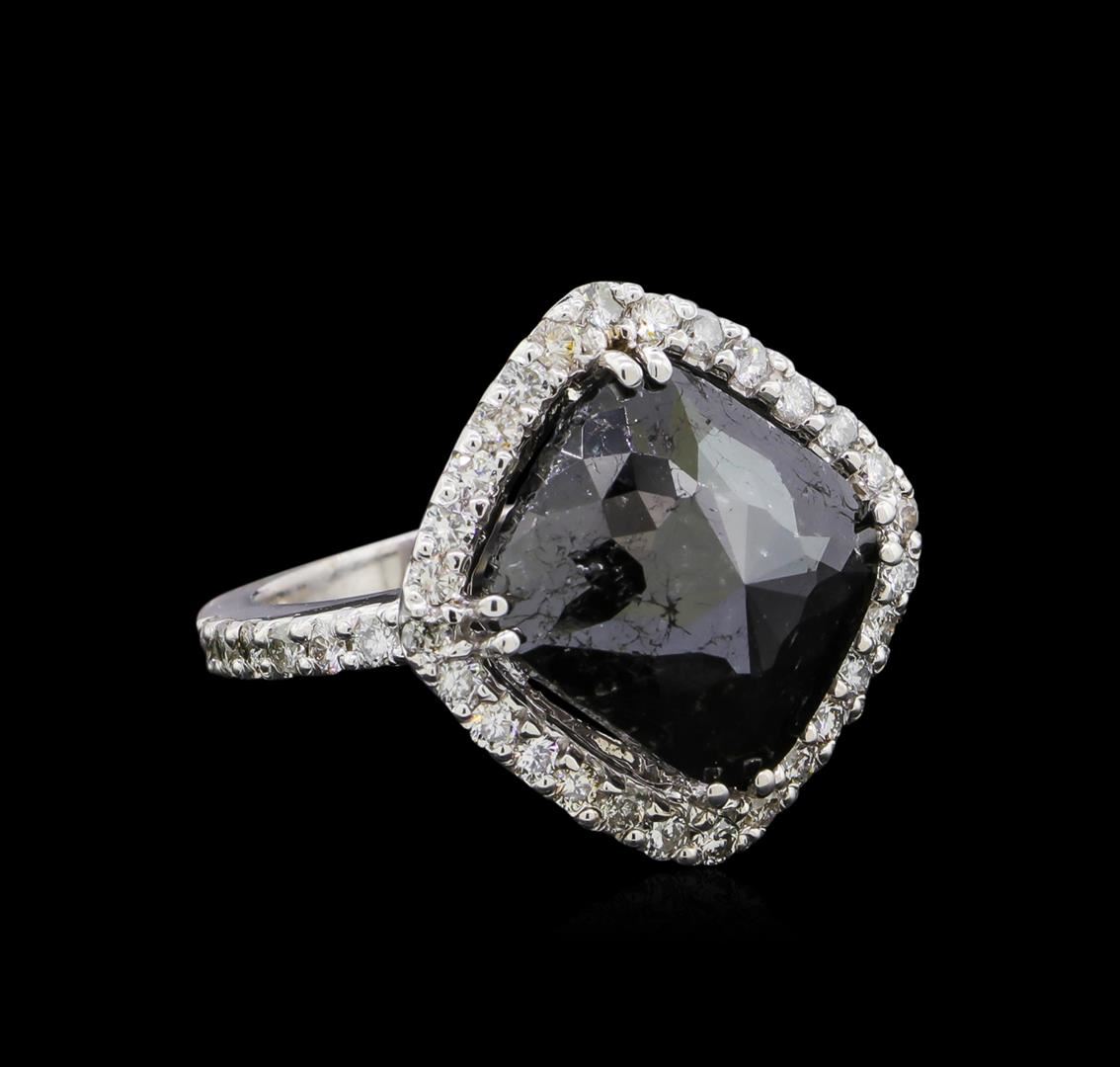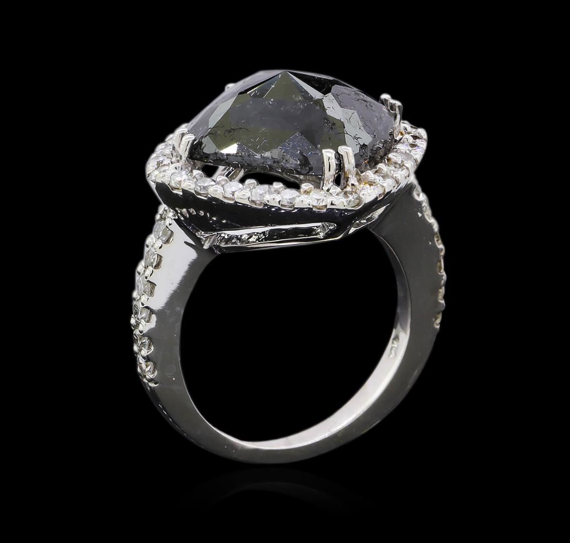 One electronically tested 14KT white gold ladies cast black and white diamond ring with a bright polish finish. The featured black diamond is set within a white diamond bezel supported by white diamond set shoulders, completed by a two millimeter wide band. Identified with markings of "K14". Condition is new, good workmanship. Containing: One prong set fancy cut diamond, measuring 13.20 x 12.10 x 5.00mm (depth est.) approximate weight of 7.36ct. Indications of multiple laboratory enhancements. Graded in the setting. Clarity Déclassé,. Color: Fancy Black; Irradiated. Forty prong set round brilliant cut diamonds, measuring 1.90 - 1.80 x 1.11mm (depth est.) approximate total weight of 40 Stones = 0.94ct. Graded in the setting. Clarity: I-1 to I-2. Color: G - I. Total Weight of Diamonds 8.30ct. Total Weight of Ring 9.11gm. AIG Appraised at $13,230.00.