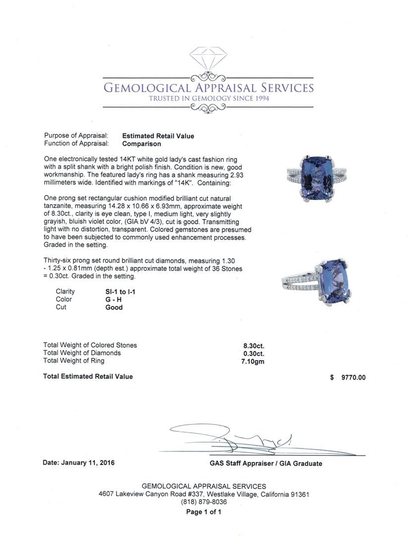 One electronically tested 14KT white gold lady's cast fashion ring with a split shank with a bright polish finish. The featured lady's ring has a shank measuring 2.93 millimeters wide. Identified with markings of "14K". Condition is new, good workmanship. Containing: One prong set rectangular cushion modified brilliant cut natural tanzanite, measuring 14.28 x 10.66 x 6.93mm, approximate weight of 8.30ct., clarity is eye clean, type I, medium light, very slightly grayish, bluish violet color, (GIA bV 4/3), cut is good. Transmitting light with no distortion, transparent. Colored gemstones are presumed to have been subjected to commonly used enhancement processes. Graded in the setting. Thirty-Six prong set round brilliant cut diamonds, measuring 1.30 - 1.25 x 0.81mm (depth est.) approximate total weight of 36 Stones = 0.30ct. Graded in the setting. Clarity: SI-1 to I-1. Color: G - Good. Total Weight of Colored Stones 8.30ct. Total Weight of Diamonds 0.30ct. Total Weight of Ring 7.10gm. GAS Appraised at $9,770.00.