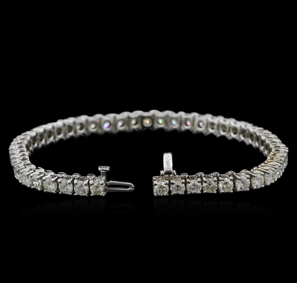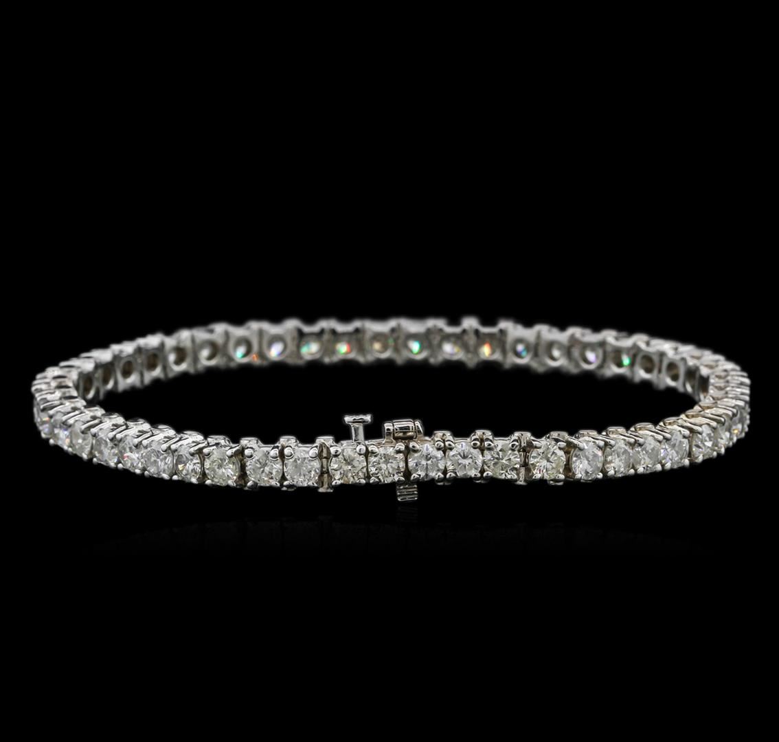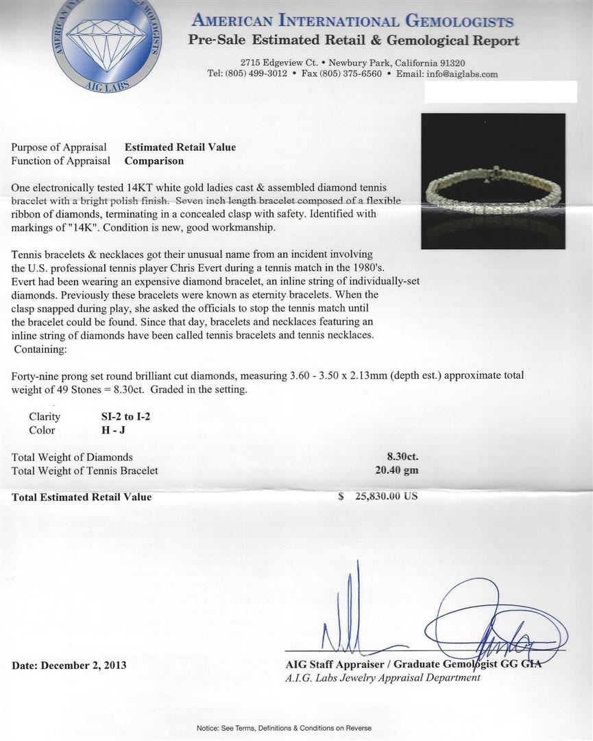 One electronically tested 14KT white gold ladies cast & assembled diamond tennis bracelet with a bright polish finish. Seven inch length bracelet composed of a flexible ribbon of diamonds, terminating in a concealed clasp with safety. Identified with markings of "14K". Condition is new, good workmanship. TENNIS. Containing: Forty-nine prong set round brilliant cut diamonds, measuring 3.60 - 3.50 x 2.13mm (depth est.) approximate total weight of 49 Stones = 8.30ct. Graded in the setting. Clarity: SI-2 to I-2. Color: H-J. Total Weight of Diamonds: 8.30ct. Total Weight of Tennis Bracelet: 20.40 grams. AIG Appraised at $25,830.00.