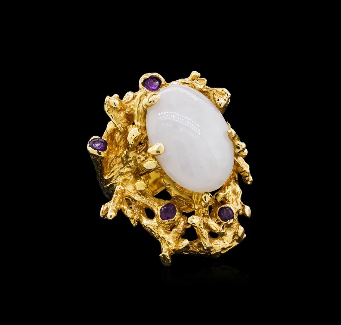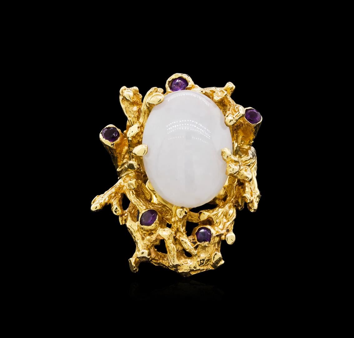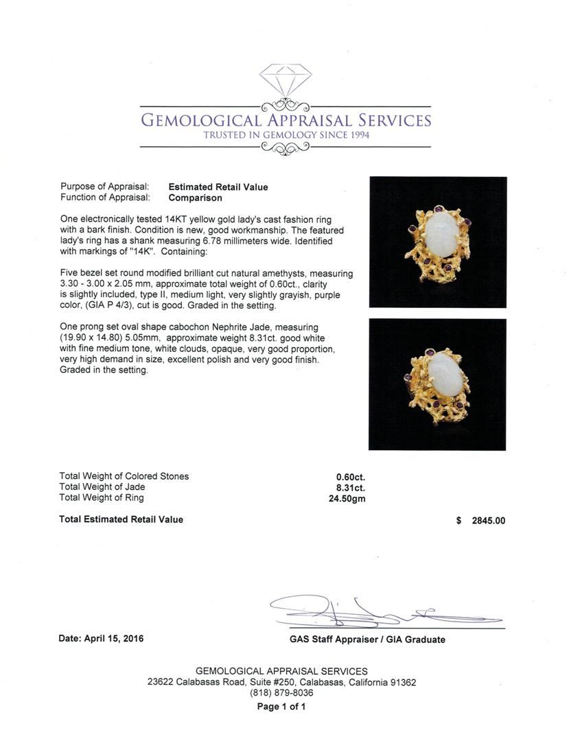 One electronically tested 14KT yellow gold lady's cast fashion ring with a bark finish. The featured lady's ring has a shank measuring 6.78 millimeters wide. Identified with markings of "14K". Condition is new, good workmanship. Containing: Five bezel set round modified brilliant cut natural amethysts, measuring 3.30 - 3.00 x 2.05 mm, approximate total weight of 0.60ct., clarity is slightly included, type II, medium light, very slightly grayish, purple color, (GIA P 4/3), cut is good. Graded in the setting. One prong set oval shape cabochon Nephrite Jade, measuring (19.90 x 14.80) 5.05mm, approximate weight 8.31ct. good white with fine medium tone, white clouds, opaque, very good proportion, very high demand in size, excellent polish and very good finish. Graded in the setting. Total Weight of Colored Stones 0.60ct. Total Weight of Jade 8.31ct. Total Weight of Ring 24.50gm. GAS Appraised at $2,845.00.