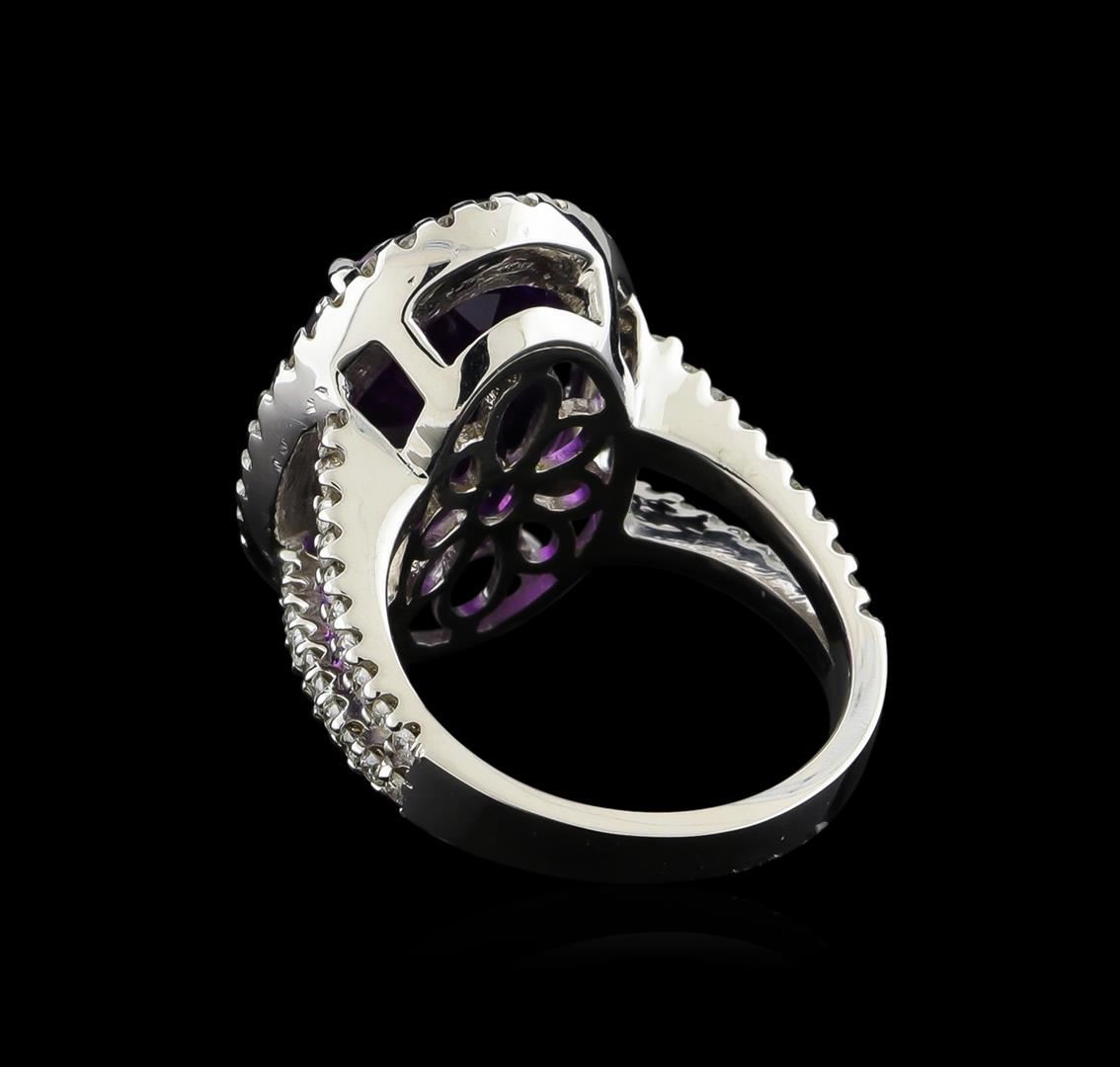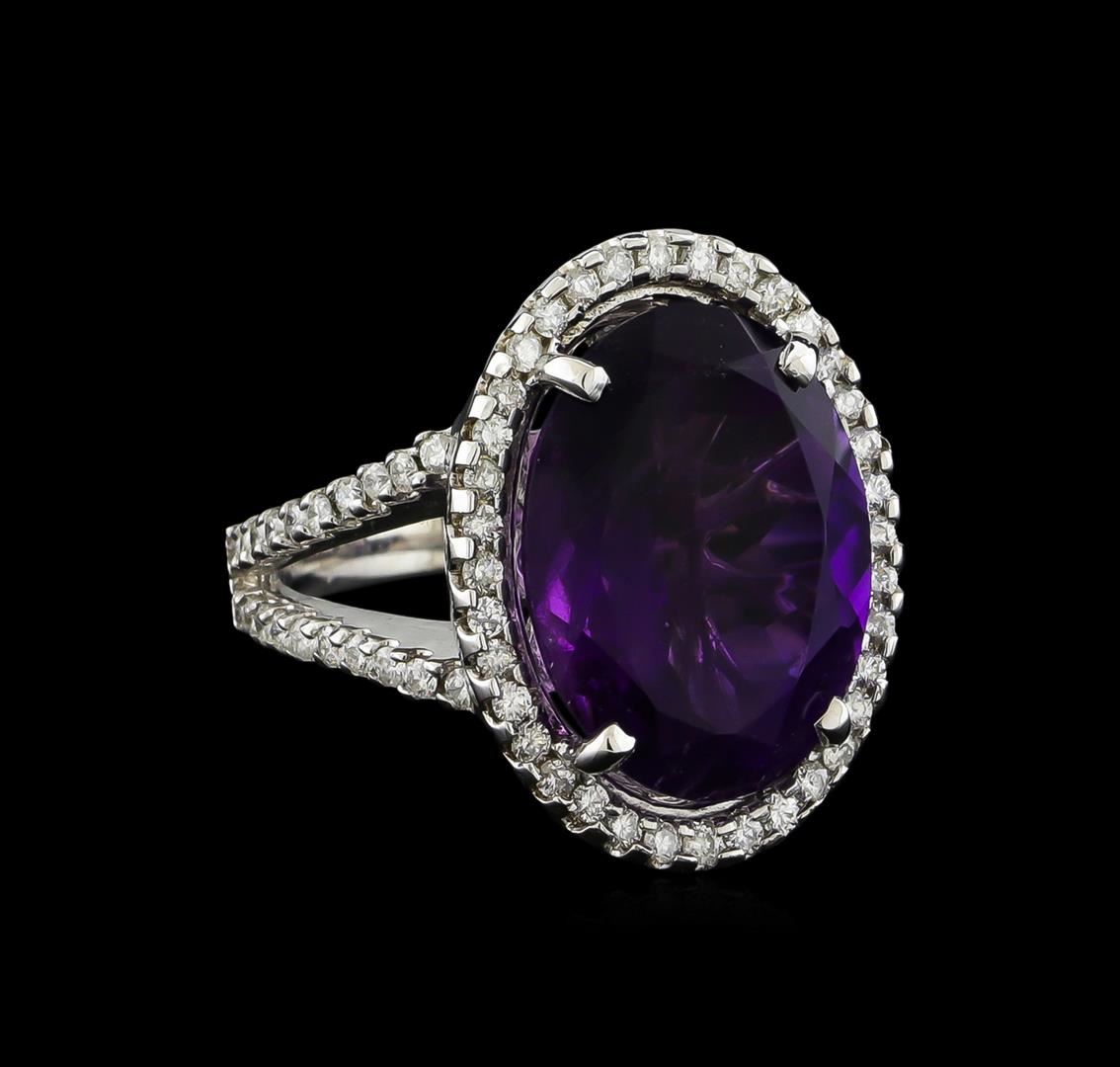 One electronically tested 14KT white gold ladies cast amethyst and diamond ring with a bright polish finish. The featured amethyst is set within a diamond bezel supported by a lattice under gallery and diamond set split shoulders, completed by a two and one-half millimeter wide band. Identified with markings of "14K". Condition is new, good workmanship. Containing: One prong set oval mixed cut natural amethyst, measuring 15.90 x 11.90 x 7.85mm, exact weight 8.32ct., clarity is slightly included, type II, dark, moderately strong, purple color, (GIA P 7/4), cut is good. Transmitting light with a minimum of distortion, transparent. Naturally occurring internal & external characteristics are present. Colored Stone Grading Report attached. Graded in the setting. Seventy-Six prong set round brilliant cut diamonds, measuring 1.40 - 1.30 x 0.81mm exact total weight 76 Stones = 0.70ct. Graded in the setting. Clarity: SI-2 to I-2. Color: F - H. Total Weight of Colored Stones 8.32ct. Total Weight of Diamonds 0.70ct. Total Weight of Ring 8.80gm. AIG Appraised at $3,820.00.
