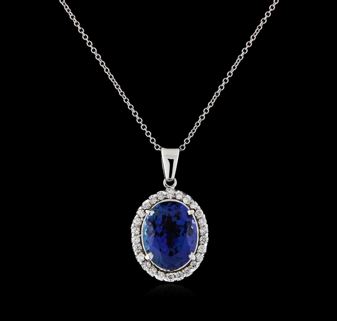 One electronically tested 14KT white gold ladies cast & assembled tanzanite and diamond pendant with chain. The pendant features a tanzanite set within a diamond bezel completed by a bail. The pendant is supported by an eighteen inch length 14KT white gold cable chain, terminating in a lobster claw clasp. Bright polish finish. Identified with markings of "14K". Condition is new, good workmanship. Containing: One prong set oval mixed cut natural tanzanite, measuring 14.00 x 11.20 x 7.40mm, 2%. bulge factor, approximate weight of 8.33ct., clarity is eye clean, type I, medium dark, very slightly grayish, violetish blue color, (GIA vB 6/3), cut is good. Transmitting light with no distortion, transparent. Colored Stone Grading Report attached. Graded in the setting. Tanzanite is a very rare gemstone that is only found in the country of Tanzania. Originally discovered in 1967. Tiffany & Company, named the stone Tanzanite. It is found in the Usumburu Mountains that border the Umba Valley of northern Tanzania. Tanzanite occurs in gray, brown, violet, blue, reddish-purple, & green. The gem is interesting because of its exceptional pleochroism. Rotated in different directions a tanzanite will exhibit multiple changes of color. Tanzanite has a low tolerance to ultrasonic cleaning, and should not be cleaned using this method. Twenty-Six prong set round brilliant cut diamonds, measuring 1.70 - 1.70 x 1.02mm (depth est.) approximate. Total Weight of 26 Stones = 0.48ct. Graded in the setting. Clarity: SI-2 to I-2. Color: F - H. Total Weight of Colored Stones 8.33ct. Total Weight of Diamonds 0.48ct. Total Weight of Pendant With Chain 8.05gm. AIG Appraised at $20,720.00.