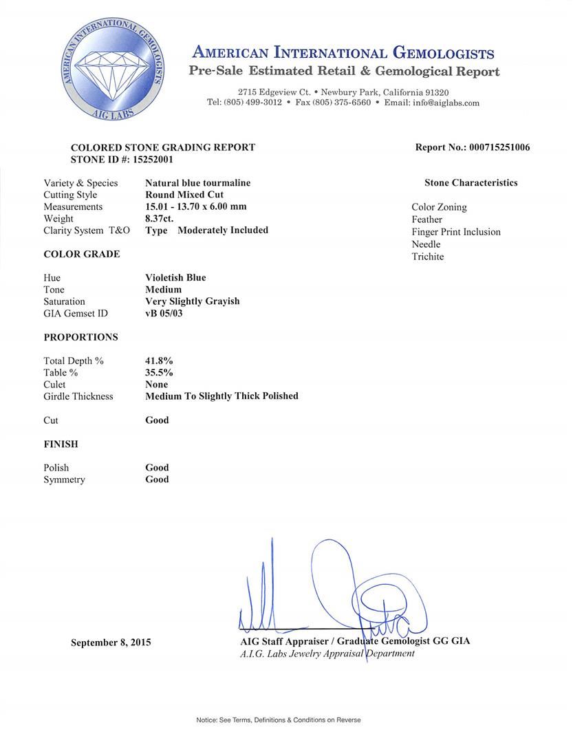 One electronically tested 14KT white gold ladies cast tourmaline and diamond ring with a bright polish finish. The featured tourmaline is set within tiered diamond bezels supported by diamond set shoulders, completed by a two millimeter wide band. Identified with markings of "14K". Condition is new, good workmanship. Containing: One prong set round mixed cut natural blue tourmaline, measuring 15.01 - 13.70 x 6.00 mm, approximate weight of 8.37ct., clarity is moderately included, medium, very slightly grayish, violetish blue color, (GIA vB 5/3), cut is good. Transmitting light with a minimum of distortion, transparent. Naturally occurring internal & external characteristics are present. Refractive index testing results of 1.62 to 1.64. This is a conclusive result for tourmaline. Colored Stone Grading Report attached. Graded in the setting. Seventy-Eight prong set round brilliant cut diamonds, measuring 1.50 - 1.30 x 0.84mm (depth est.) approximate total weight of 78 Stones = 0.88ct. Graded in the setting. Clarity: I-1 to I-2. Color: G - I. Total Weight of Colored Stones 8.37ct. Total Weight of Diamonds 0.88ct. Total Weight of Ring 9.19gm. AIG Appraised at $11,090.00.