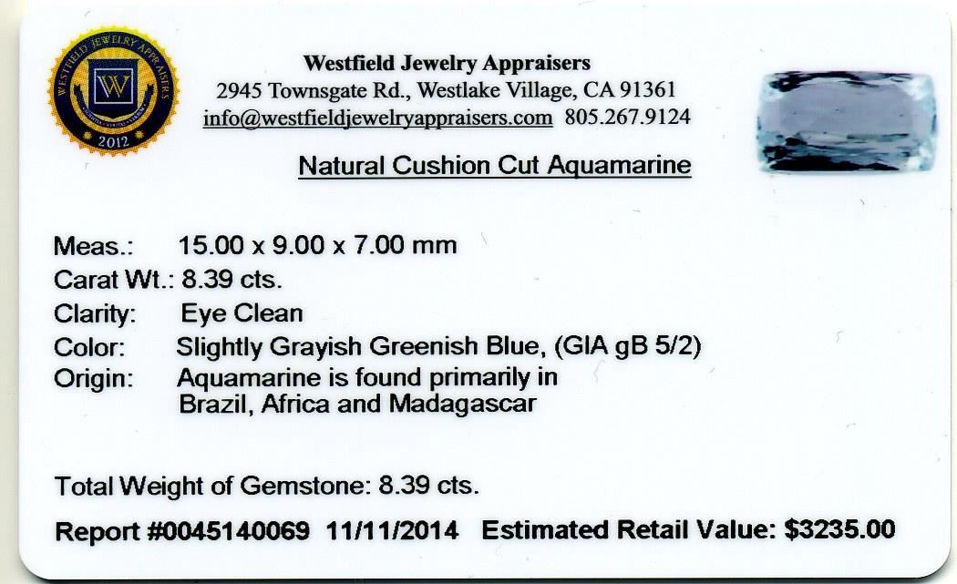 8.39ct Cushion Cut Natural Cushion Cut Aquamarine. Westfield Appraised at $3,235.00.