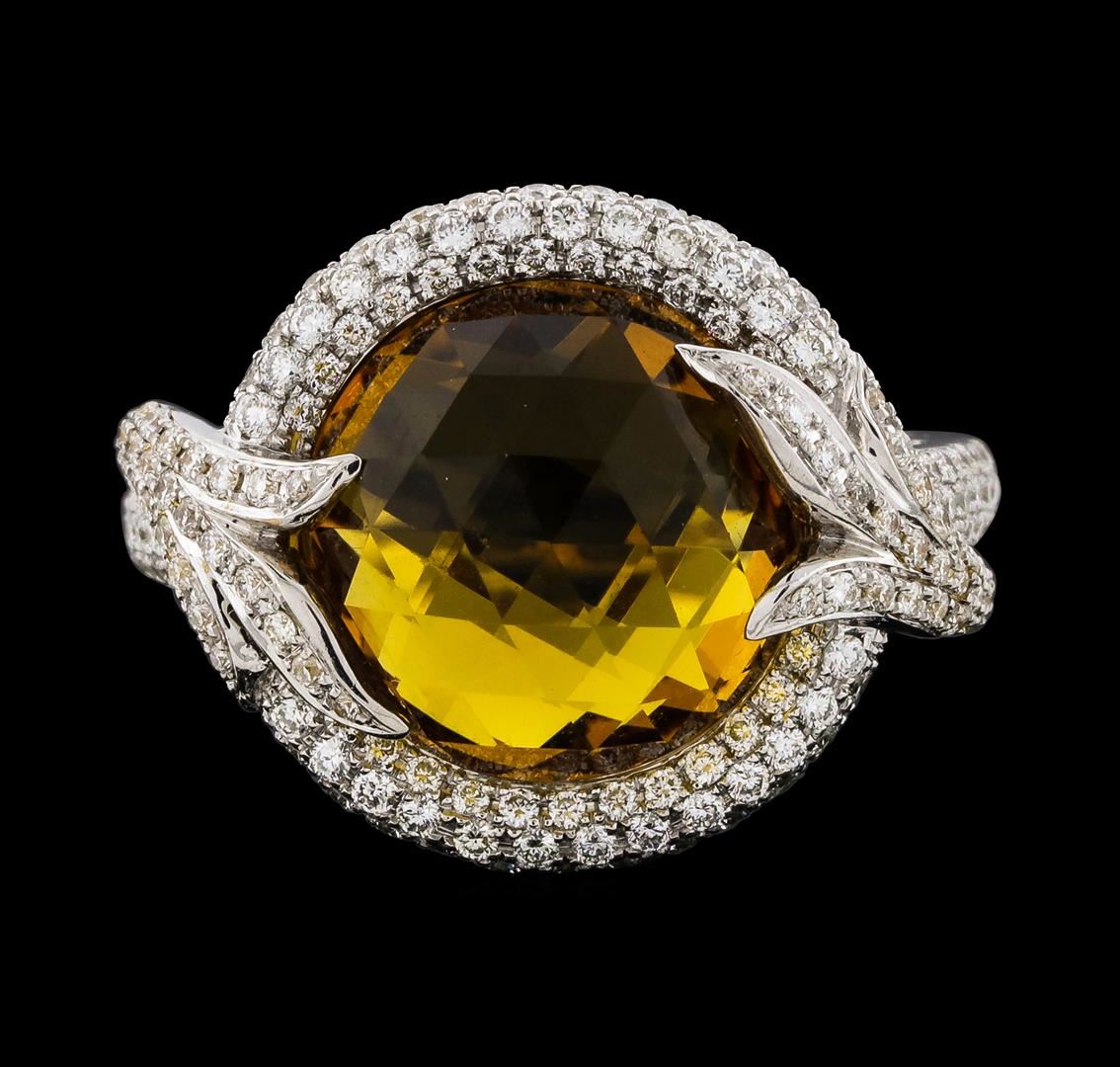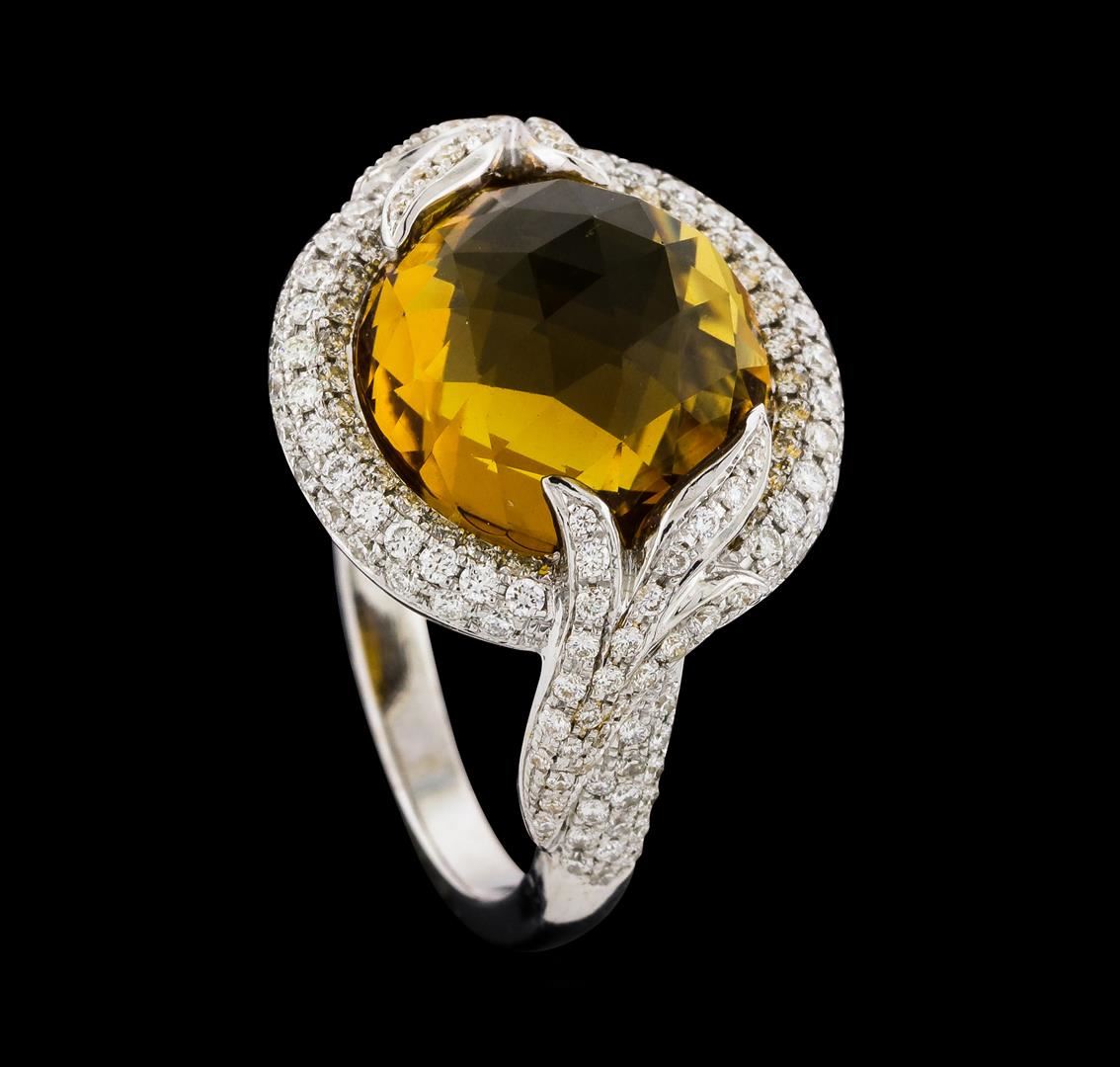 One Yellow Topaz and Diamond Ring featuring: 14KT White Gold with a total weight of 8.06 grams, Yellow Topaz with a total weight of 8.40ct, and side diamonds with a weight of 0.72ctw.
