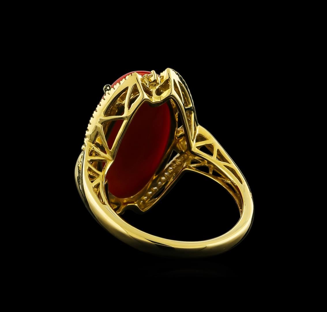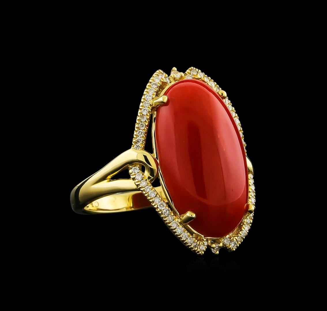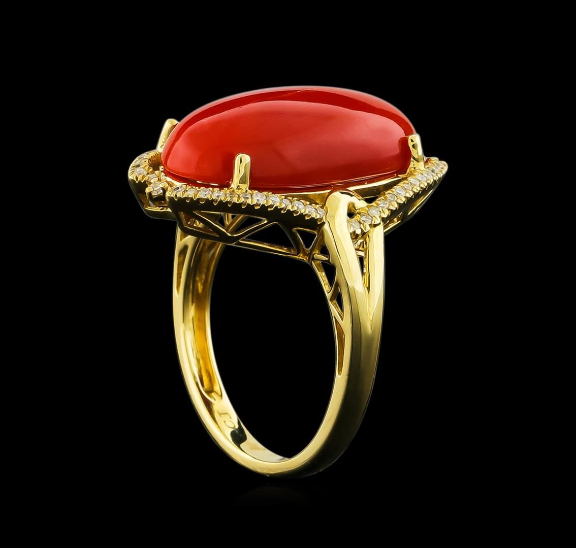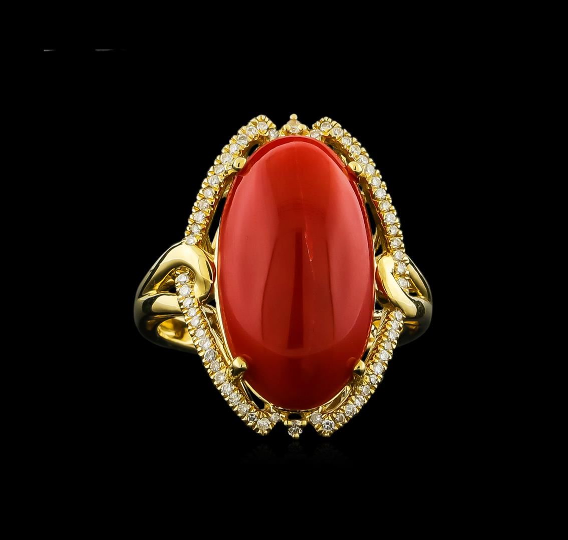 One electronically tested 14KT yellow gold lady's cast fashion ring with a basket halo with a bright polish finish. The featured lady's ring has a shank measuring 2.38 millimeters wide. Identified with markings of "14K". Condition is new, good workmanship. Containing: One prong set oval cabochon cut natural red coral, measuring 19.85 x 11.17 x 5.30mm, approximate weight of 8.41ct., clarity is severely included, dark, strong, orangy red color, (GIA oR 7/5), cut is very good. Transmitting light diffusely, opaque to translucent. Colored gemstones are presumed to have been subjected to commonly used enhancement processes. Graded in the setting. Sixty prong set round brilliant cut diamonds, measuring 1.00 - 0.90 x 0.59mm (depth est.) approximate total weight of 60 Stones = 0.20ct. Graded in the setting. Clarity: SI-1 to SI-2. Color: G - Good. Total Weight of Colored Stones 8.41ct. Total Weight of Diamonds 0.20ct. Total Weight of Ring 6.60gm GAS Appraised at $4,950.00.