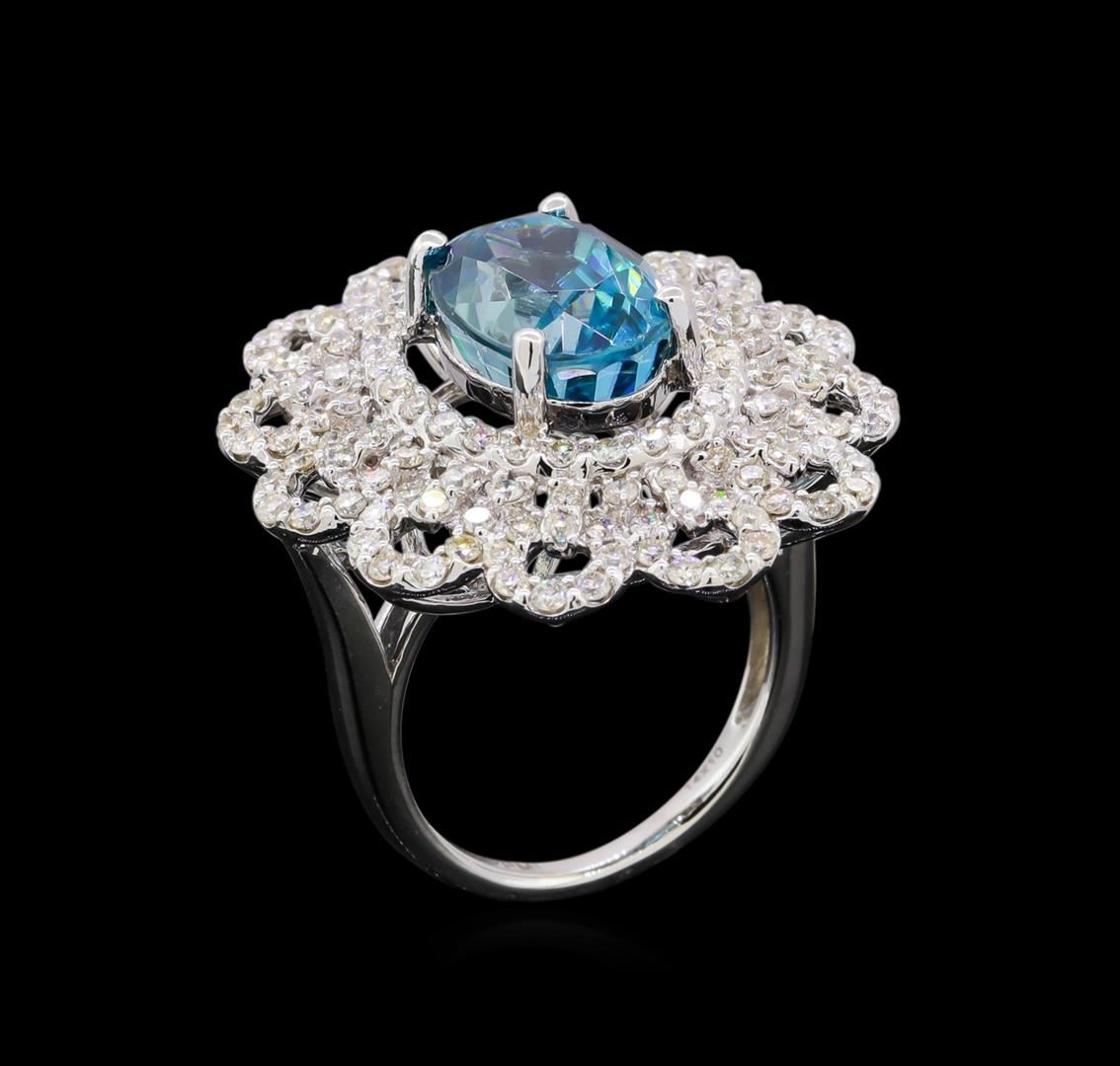 One electronically tested 14KT white gold lady's cast fashion ring with a scalloped basket halo with a bright polish finish. The featured lady's ring has a shank measuring 2.0 millimeters in width. Identified with markings of "14K". Condition is new, good workmanship. Containing: One prong set oval modified brilliant cut natural blue zircon, measuring 11.55 x 8.48 x 7.71mm, (depth est.) 15%. bulge factor, approximate weight of 8.44ct., clarity is eye clean, medium dark, moderately strong, very strongly greenish blue color, (GIA vstgB 6/4), cut is very good. Transmitting light with no distortion, transparent. Colored gemstones are presumed to have been subjected to commonly used enhancement processes. Graded in the setting. One Hundred Forty-Six prong set round brilliant cut diamonds, measuring 1.55 - 1.50 x 0.95mm (depth est.) approximate total weight of 146 Stones = 1.95ct. Graded in the setting. Clarity: VS-2 to SI-2. Color: H - I. Cut Good. Total Weight of Colored Stones 8.44ct. Total Weight of Diamonds 1.95ct. Total Weight of Ring 9.20gm. GAS Appraised at $13,460.00.