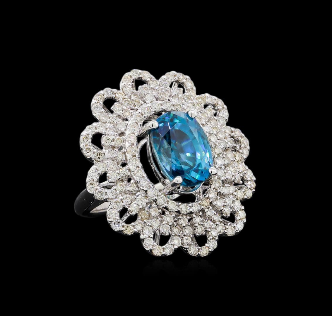One electronically tested 14KT white gold lady's cast fashion ring with a scalloped basket halo with a bright polish finish. The featured lady's ring has a shank measuring 2.0 millimeters in width. Identified with markings of "14K". Condition is new, good workmanship. Containing: One prong set oval modified brilliant cut natural blue zircon, measuring 11.55 x 8.48 x 7.71mm, (depth est.) 15%. bulge factor, approximate weight of 8.44ct., clarity is eye clean, medium dark, moderately strong, very strongly greenish blue color, (GIA vstgB 6/4), cut is very good. Transmitting light with no distortion, transparent. Colored gemstones are presumed to have been subjected to commonly used enhancement processes. Graded in the setting. One Hundred Forty-Six prong set round brilliant cut diamonds, measuring 1.55 - 1.50 x 0.95mm (depth est.) approximate total weight of 146 Stones = 1.95ct. Graded in the setting. Clarity: VS-2 to SI-2. Color: H - I. Cut Good. Total Weight of Colored Stones 8.44ct. Total Weight of Diamonds 1.95ct. Total Weight of Ring 9.20gm. GAS Appraised at $13,460.00.