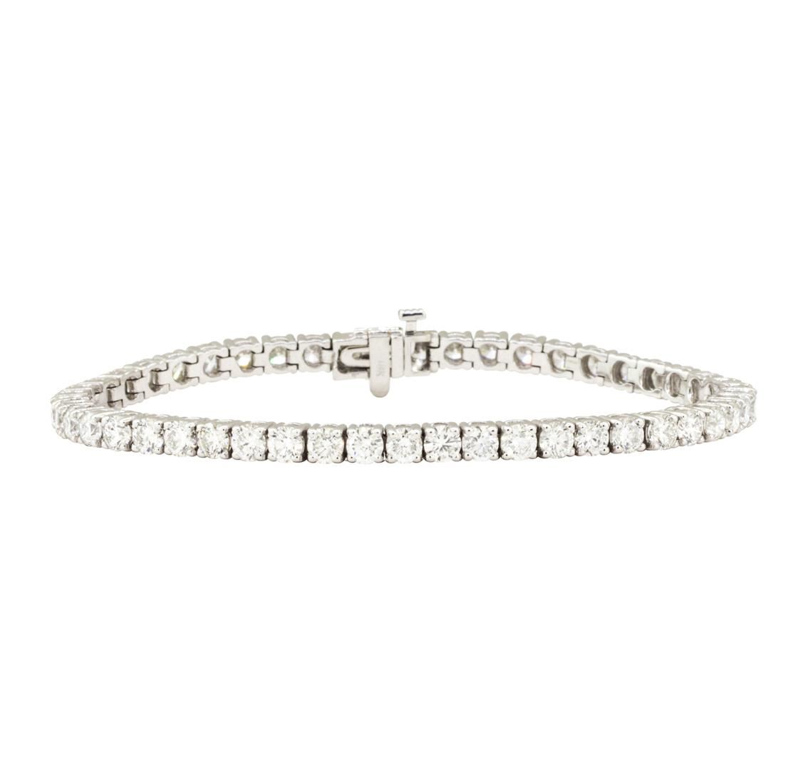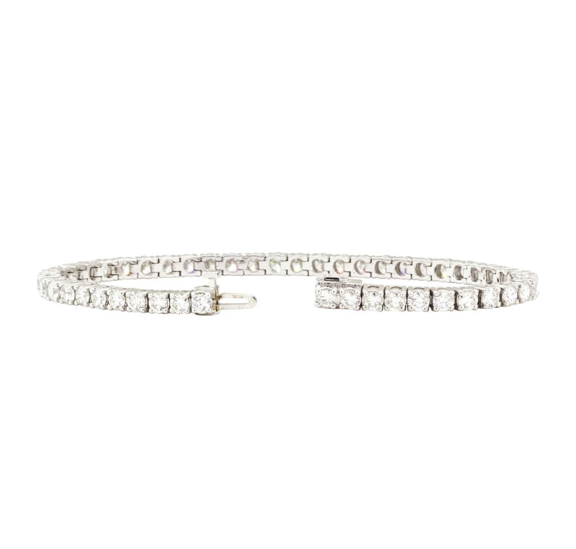 One electronically tested 18KT white gold lady's combination cast & assembled fashion straight line tennis bracelet with a tongue clasp with fold-under safety with a bright polish finish. The featured lady's tennis bracelet measures 7.00 inches in length. Identified with markings of '18K'. Condition is new, good workmanship. Containing: Forty-Nine prong set round brilliant cut diamonds, measuring 3.65 - 3.50 x 2.21mm (depth est.) approximate total weight of 49 Stones = 8.45ct. Graded in the setting. Color G Clarity VS-2 to SI-1 Cut Very Good. Total Weight of Diamonds 8.45ct.. Total Weight of Tennis Bracelet 17.00gm GAS Appraised at $33030.00. GAS Appraised.