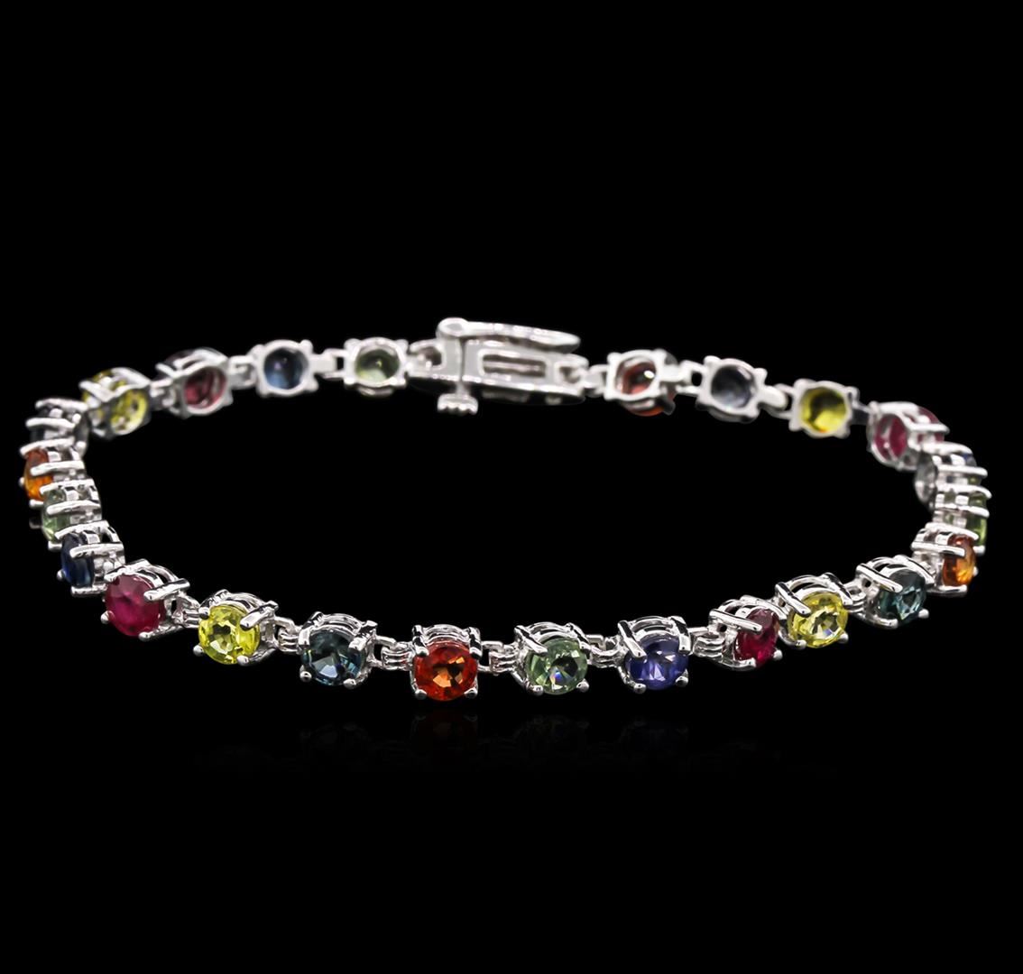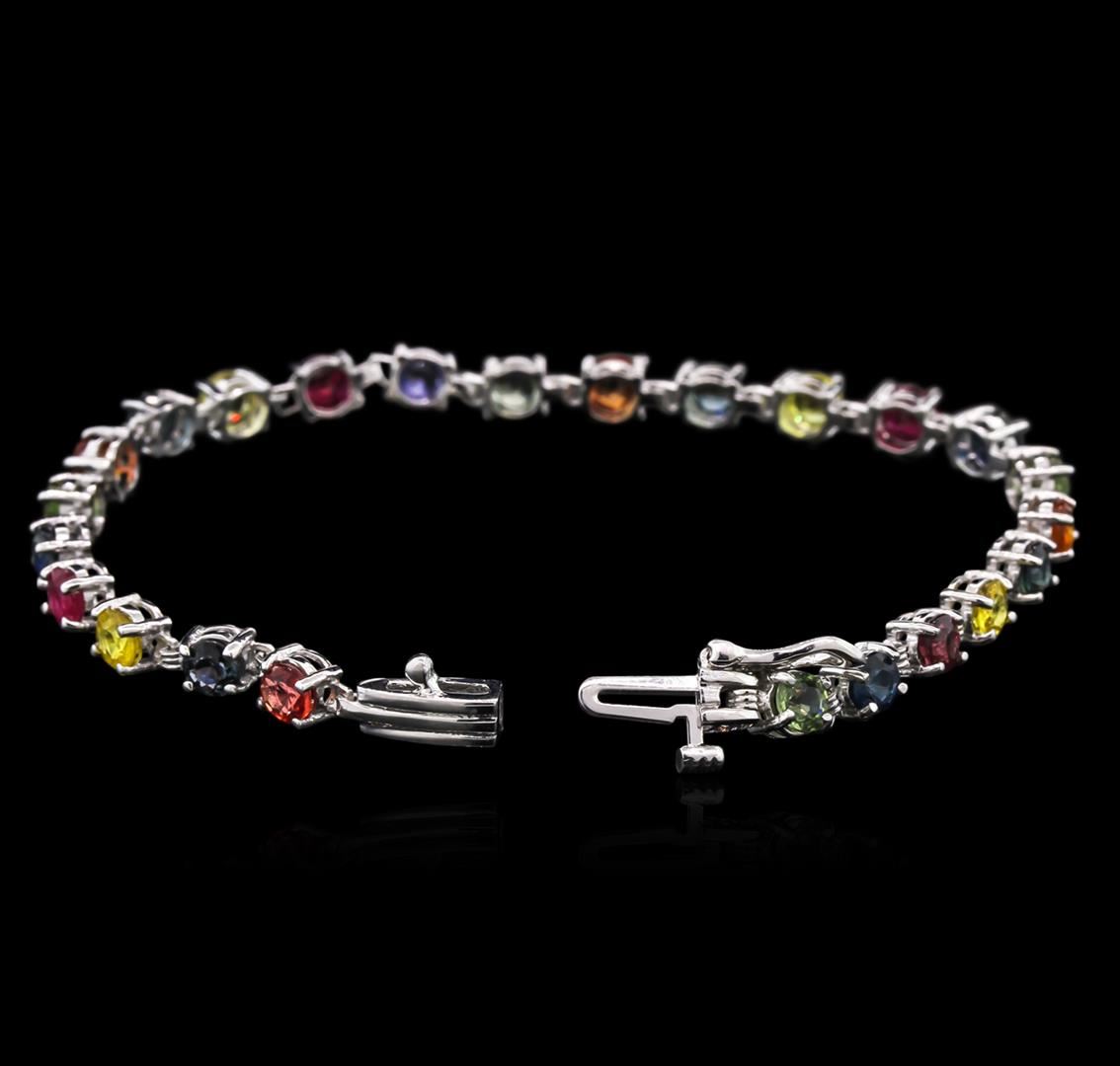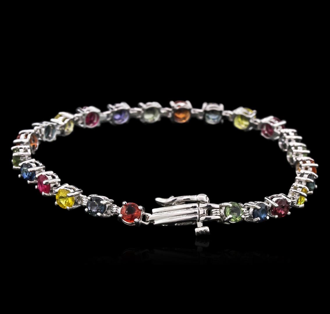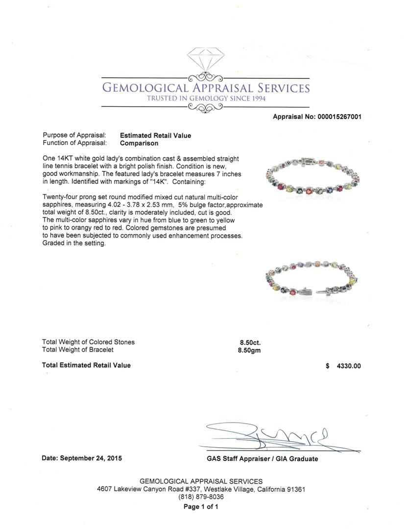 One 14KT white gold lady's combination cast & assembled straight line tennis bracelet with a bright polish finish. The featured lady's bracelet measures 7 inches in length. Identified with markings of "14K". Condition is new, good workmanship. Containing: Twenty-four prong set round modified mixed cut natural multi-color sapphires, measuring 4.02 - 3.78 x 2.53 mm, 5% bulge factor, approximate total weight of 8.50ct., clarity is moderately included, cut is good. The multi-color sapphires vary in hue from blue to green to yellow to pink to orangy red to red. Colored gemstones are presumed to have been subjected to commonly used enhancement processes. Graded in the setting. Total Weight of Colored Stones 8.50ct. Total Weight of Bracelet 8.50gm at $4330.00.. GAS Appraised at $4,330.00.